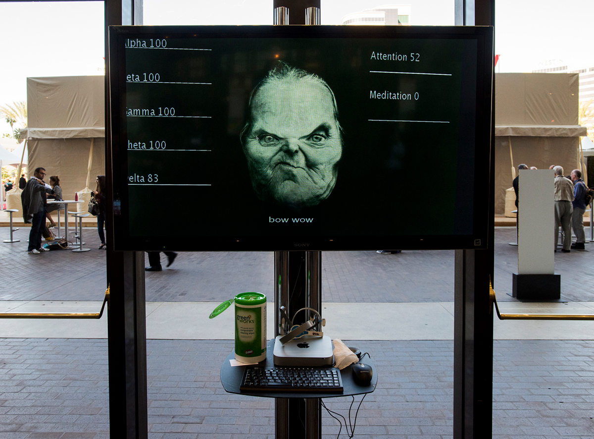 Harshit Agrawal’s (author)rise, a participative work created in collaboration with Japanese researchers Junichi Yamaoka and Yasuaki Kakehi, sought to highlight the fragmented authorship of digital text. One part of the program — trained on thousands of philosophical texts — used the text handwritten by a participant as a starting point to generate words, while another part, trained in handwriting, converted this generated text into handwriting, which the stylus began imprinting on the paper, even as it was held by the participant.