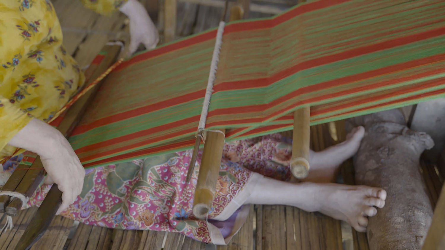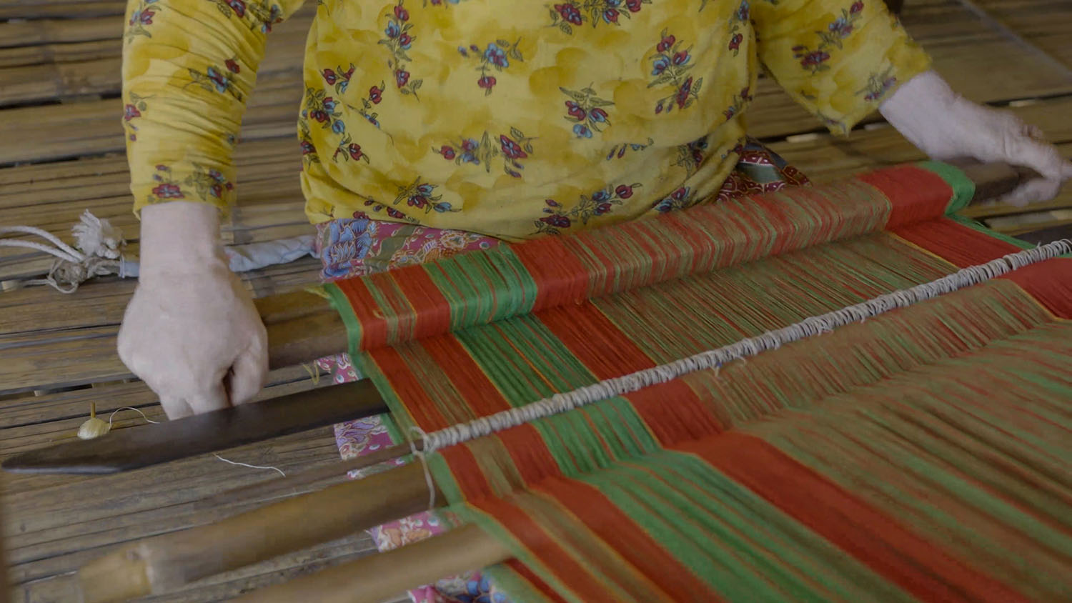 Traditionally, the various components of the loom are made of local wood or bamboo. The warp is first prepared by wrapping thread around a warping frame. It is then transferred to the loom, where heald, or heddle, sticks are used to separate alternate threads of the warp. The weft threads, either contained in a shuttle or manipulated by hand, are passed manually through the warp to create various geometric designs. Since the width of the backstrap loom is limited by the width of the weaver’s waist, any fabric woven on the backstrap loom is usually no more than half a metre wide.