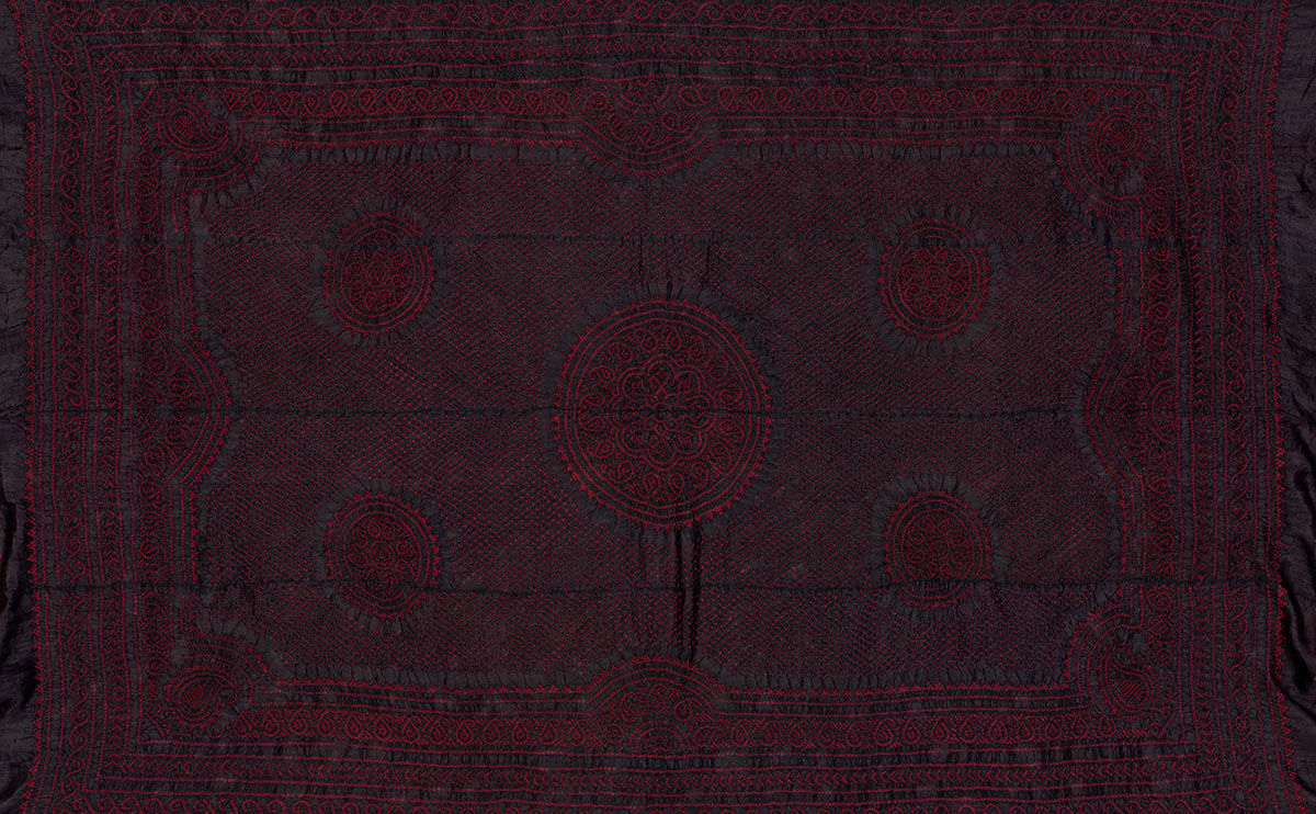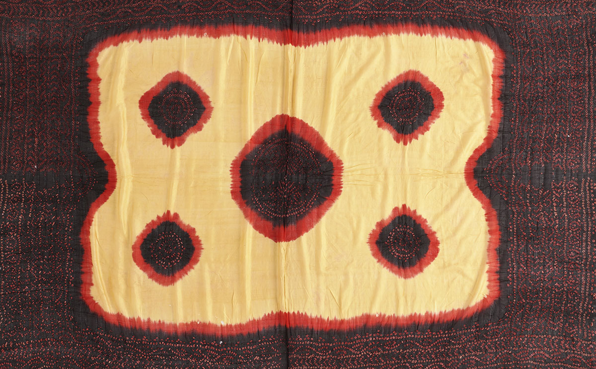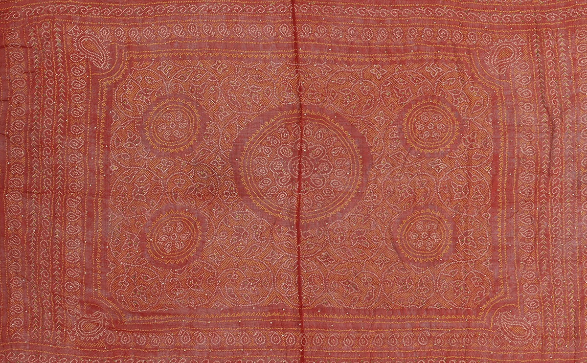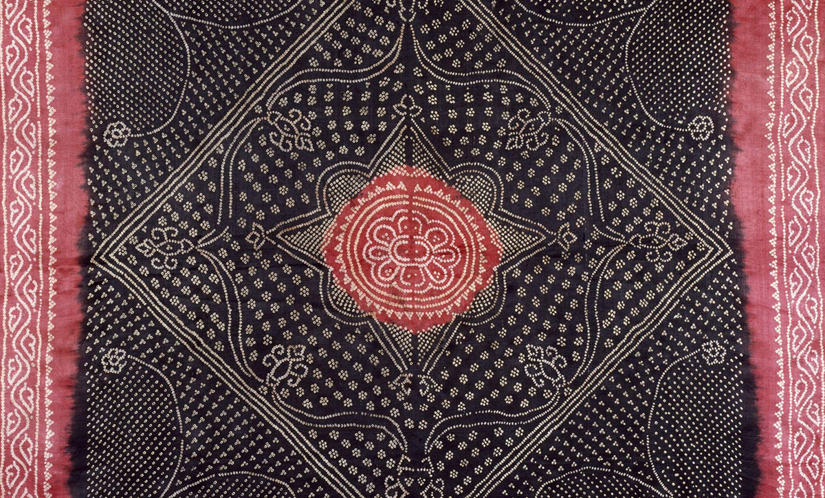 A tie-dyeing technique used to make patterned fabrics, Bandhani in its many variations is identified by light circular or square-shaped repeating motifs on a dark ground. It derives its name from the Sanskrit word baandh, meaning “to tie,” and is typically used to make unstitched attire such as odhnis and sarees. The design varies depending on the base fabric — usually plain-weave cotton, but also silk, muslin, crepe, georgette, chiffon or voile — and regional preferences and influences. Major centres for bandhani textile production include Mandvi, Bhuj, Jamnagar, Porbandar and Rajkot in Gujarat and Udaipur, Jaipur, Ajmer and Bikaner in Rajasthan.
