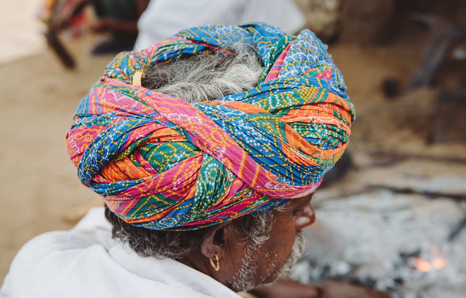 While Gujarati designs usually feature repeating motifs, bandhani fabrics from Rajasthan typically have concentric, multi-coloured circles and large dots called dabbi. Initially produced for royalty, using expensive ingredients such as saffron and a colour palette that varied with seasons and occasions, they came to be produced for use by the local communities, with the colours standing as social designators of community, social position, occupation and marital status of the person wearing it. Widely used for the cloth headgear or Saafa of Rajasthani men, the tie-dyed multi-coloured bandhani, as well as leheriya, turbans are reserved for elderly or respected members of the community, while the block-printed imitations are more likely to be used by the younger generations. Bishnoi women typically wear a red patterned odhni with black circular forms, while mothers with newborn children wear a yellow veil called piliyo, with red dots if the child is male.