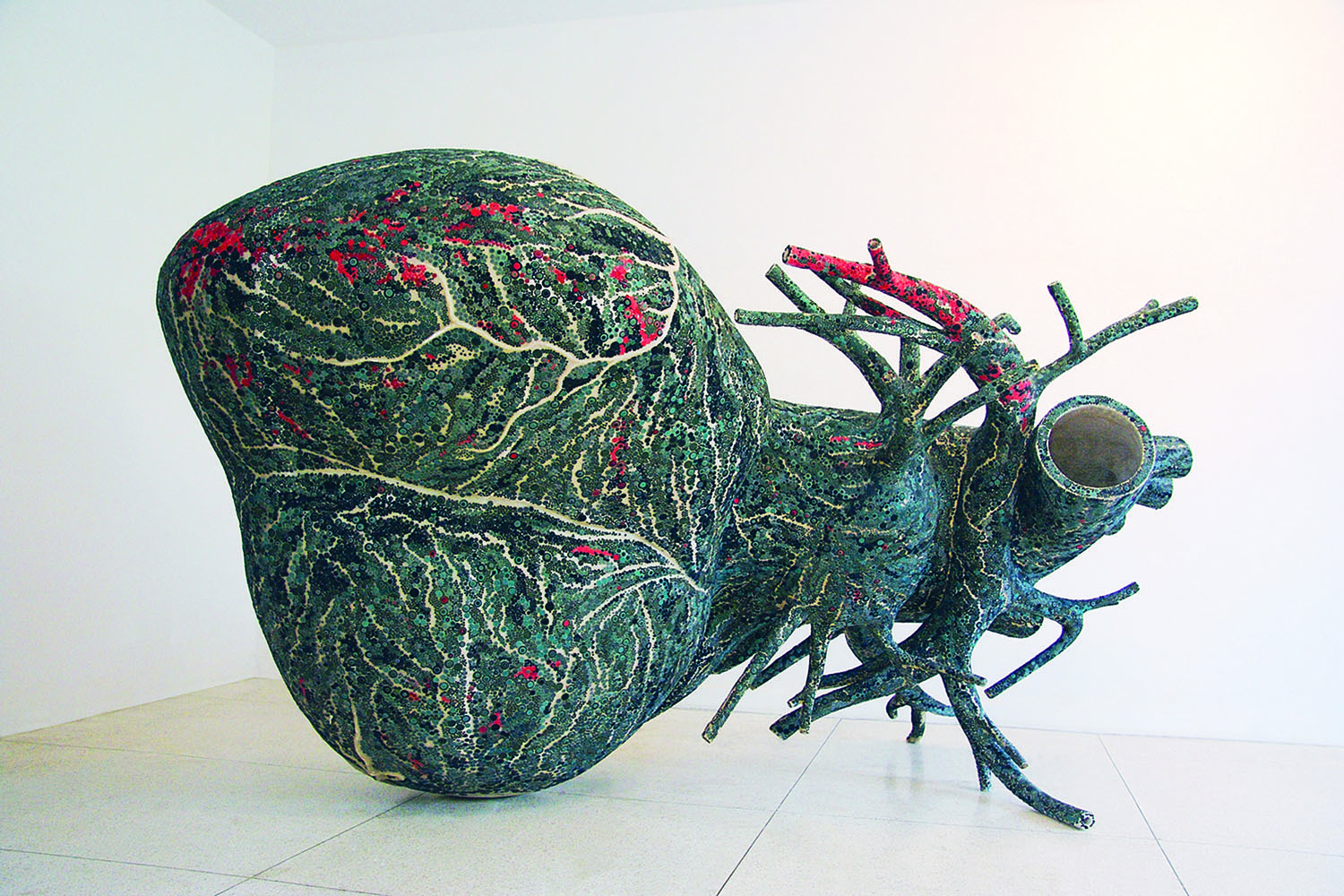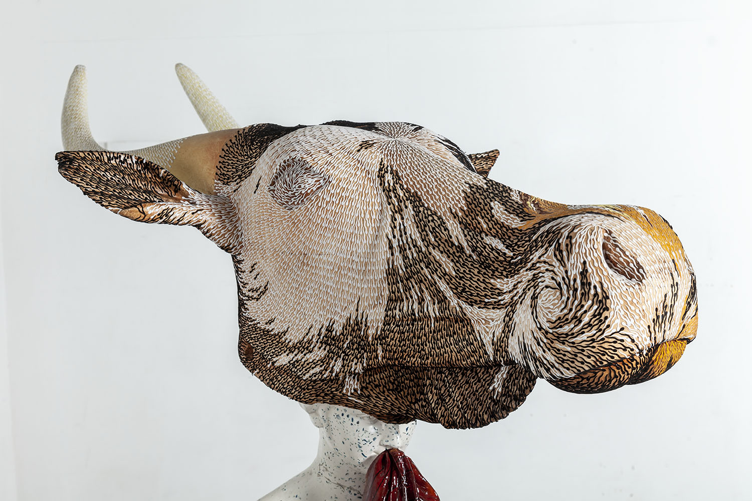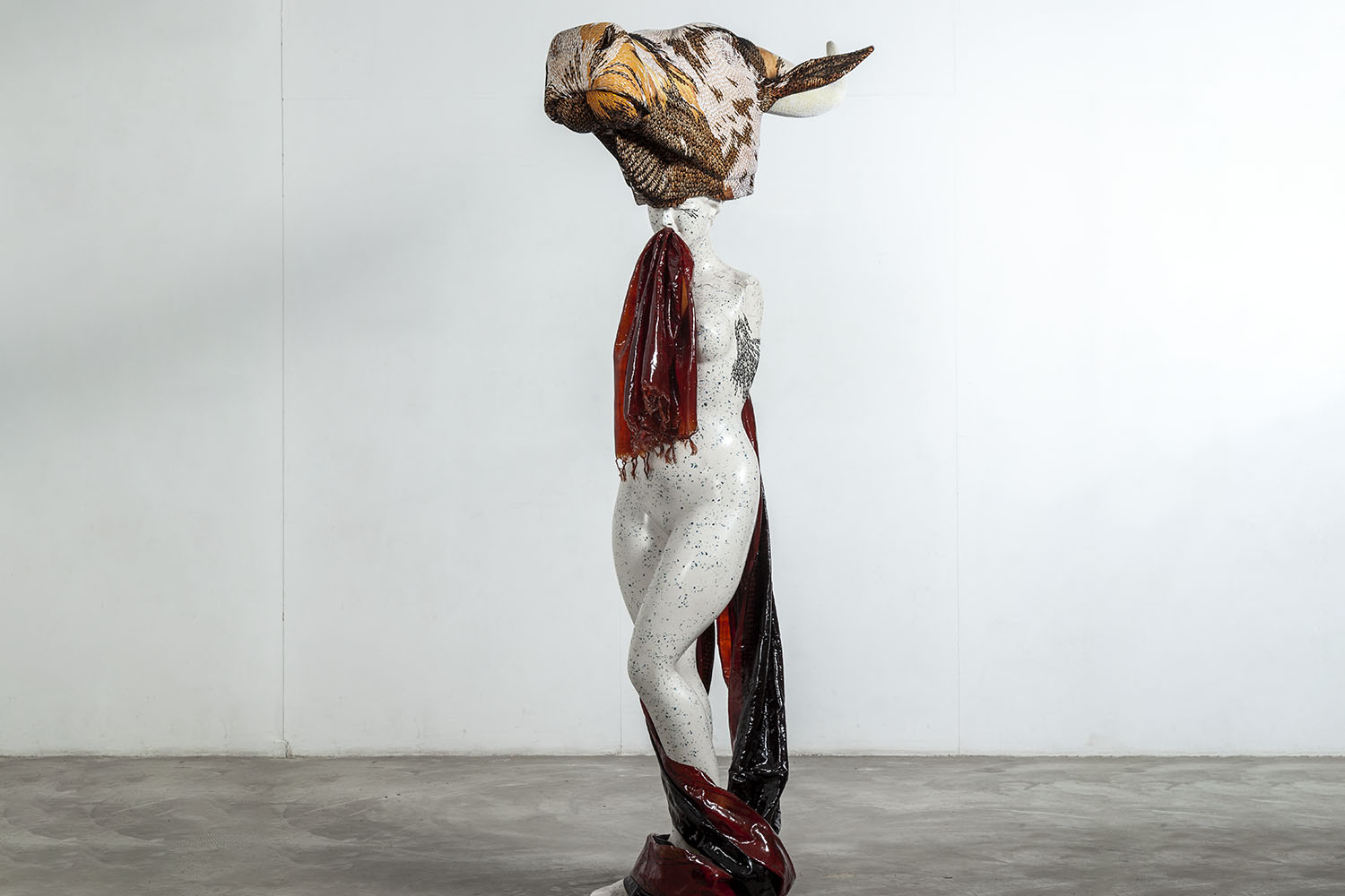 Another prominent part of Kher’s practice are her sculptural works. Created using various mediums and replete with chimeras and mythical figures, they challenge patriarchal and anthropocentric narratives. The Girl With The Hairy Lip Said No (2004) features a crochet tablecloth upon which lies broken porcelain and a cup with a fistful of hair — alluding to the perceived havoc wrought by the refusal of a marriage proposal by a girl. In the part-animal, part-human composite of Arione (2004), a dominatrix serves muffins on a tray upon which her naked breast rests, speaking to the repressed fantasies of womanhood.