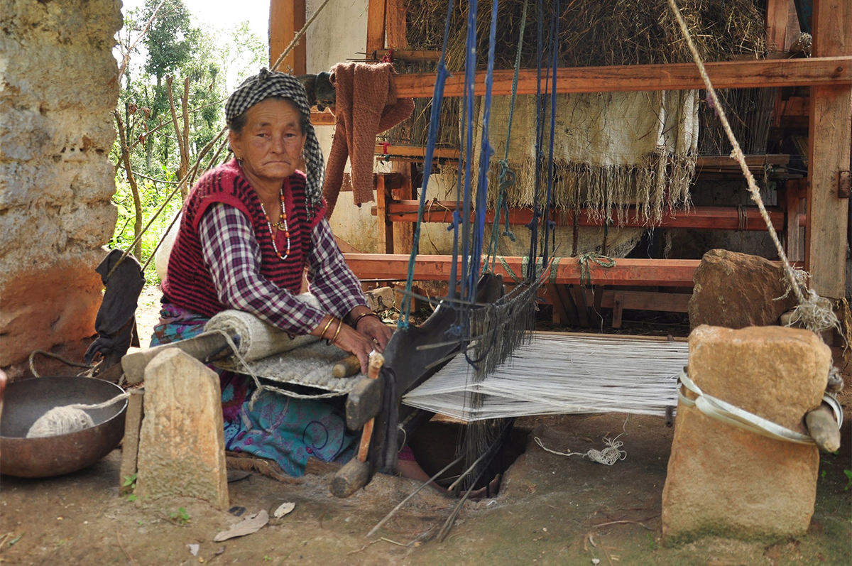 The Bhotia people of the upper Himalayan regions of Kumaon and Garhwal in Uttarakhand, northern India, are known for making woollen goods such as carpets (dann and asan), blankets (thulma and chutka) and shawls (pankhi and pakhi). The weaving is done by the women of various Bhotia groups, and is historically associated with the communities’ transhumance and trade with Tibet.