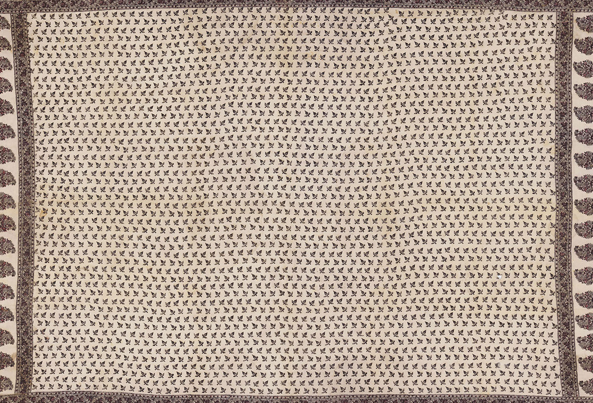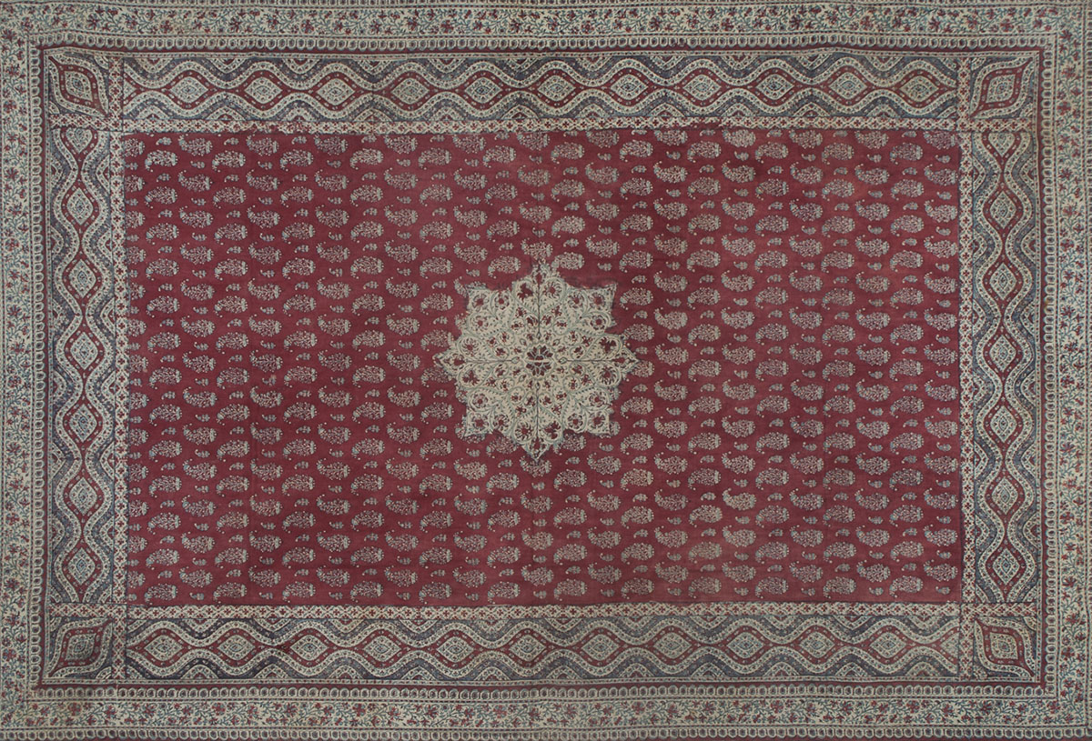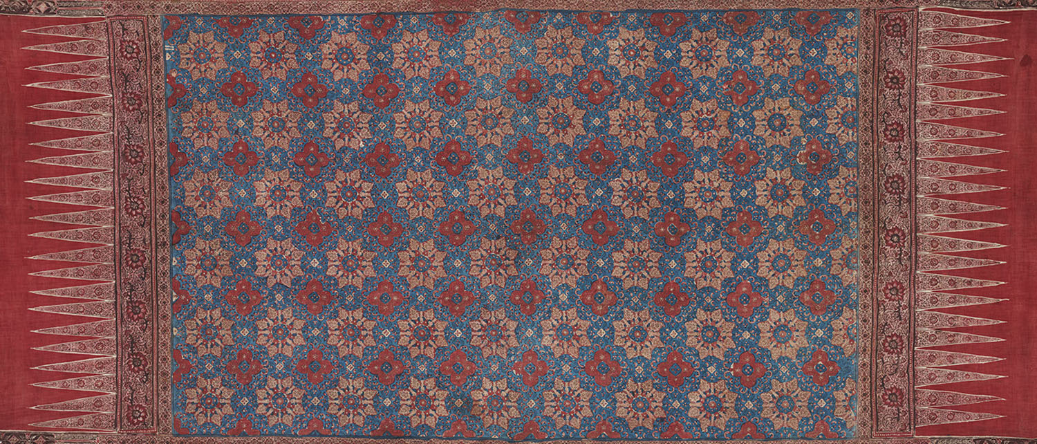 The process of stamping designs and patterns on base fabrics such as cotton or silk using dye-soaked, hand-carved wooden blocks. The technique is central to a variety of printing traditions across India in which blocks are used to create a range of designs composed of floral and religious motifs, geometric forms, and calligraphy. Some of these block printing traditions include ajrakh, Bagh, Bagru, Sanganeri, saudagiri, mata ni pachedi, namavali, and balotra, as well as the less popular traditions of the Chhimba community in Punjab and the more recent printing practices in Serampore of West Bengal. While several Indian communities practise the craft, the Khatris and Chippas in the country’s northwestern regions are the oldest known communities to have been continuously involved in block printing, since at least the sixteenth century.