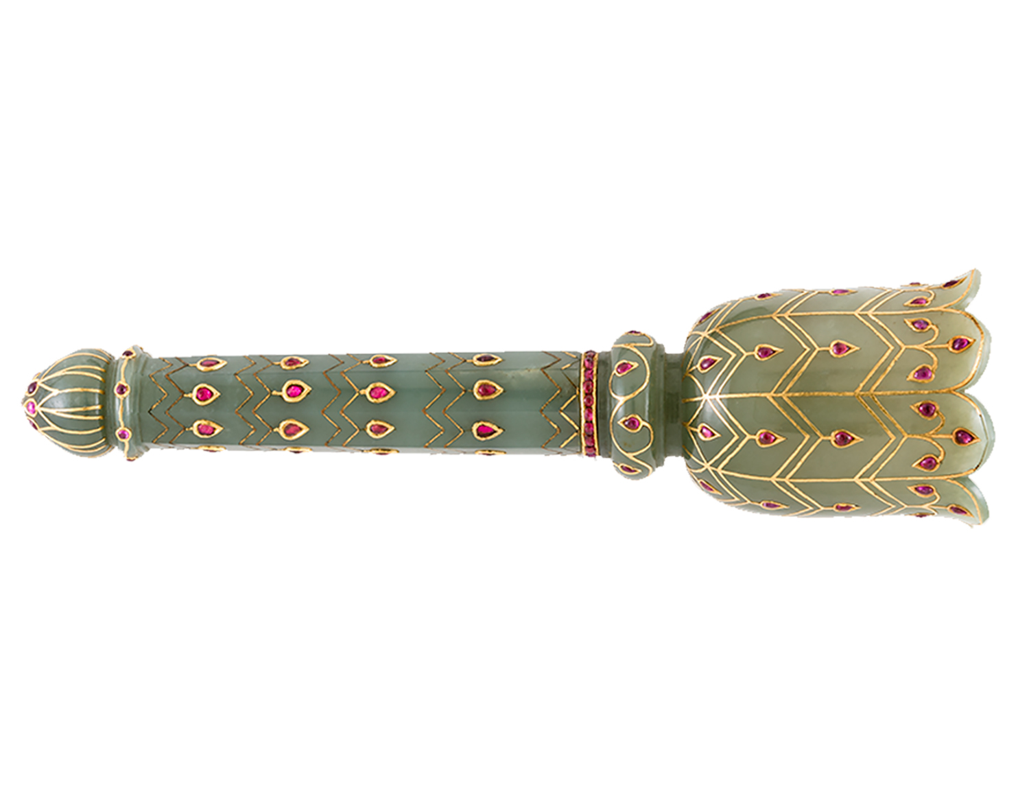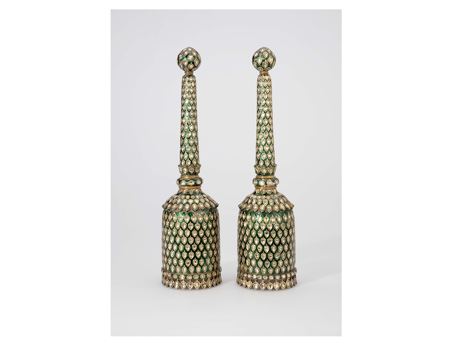 Fly-whisks were often made as a pair, presumably owing to their use by two attendants standing on either side of a ruler in court. A typical chowrie has a slim handle between 40 and 60 centimetres long that tapers towards the bottom, whereas a morchal usually has a shorter and thicker handle. The fibres of the whisk are generally fixed, using small grips, into a cup-like head that is attached to the top of the handle in various ways, including sometimes a metal tang extending into the handle. The materials used to construct the handles of chowries and morchals range from wood to more expensive materials such as beaten silver, gold, copper, ivory, nephrite jade or banded agate. They are also often decorated with engravings or repoussé motifs, or inlaid with precious stones. Mughal chowrie handles feature extremely precise, decorative naturalistic carvings in the symmetrical, detailed style typical of the period, depicting flora such as marigolds, lilies, poppies and cypress branches, and the cup itself is often stylised as a blooming flower.