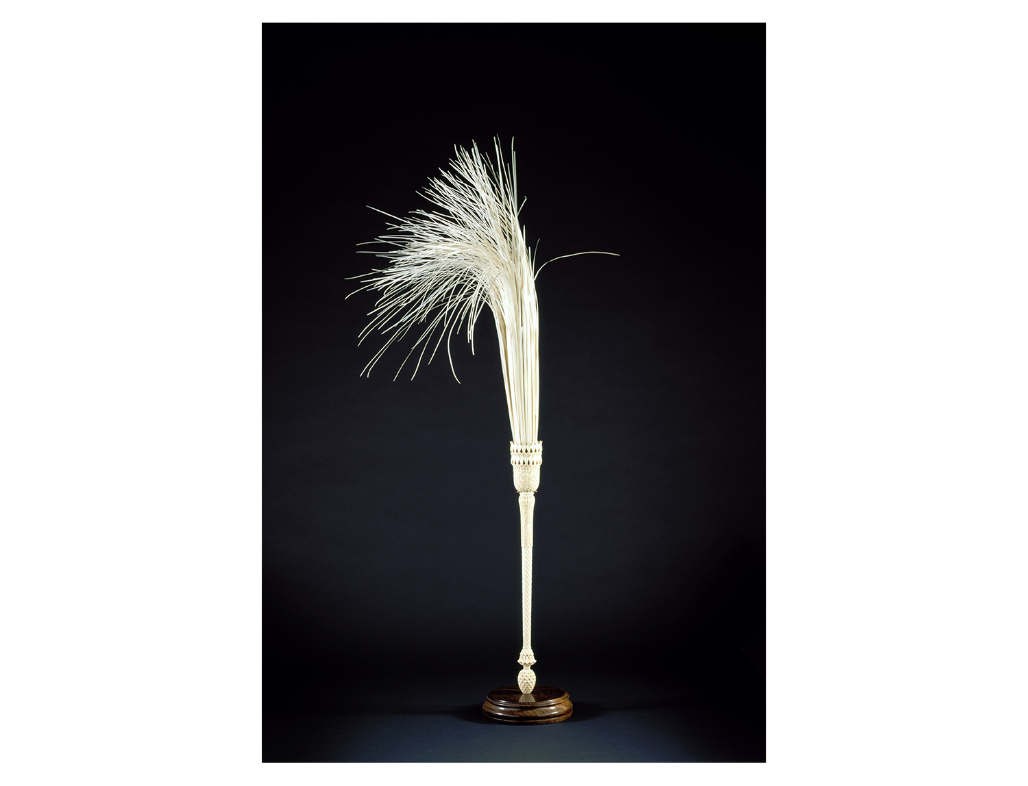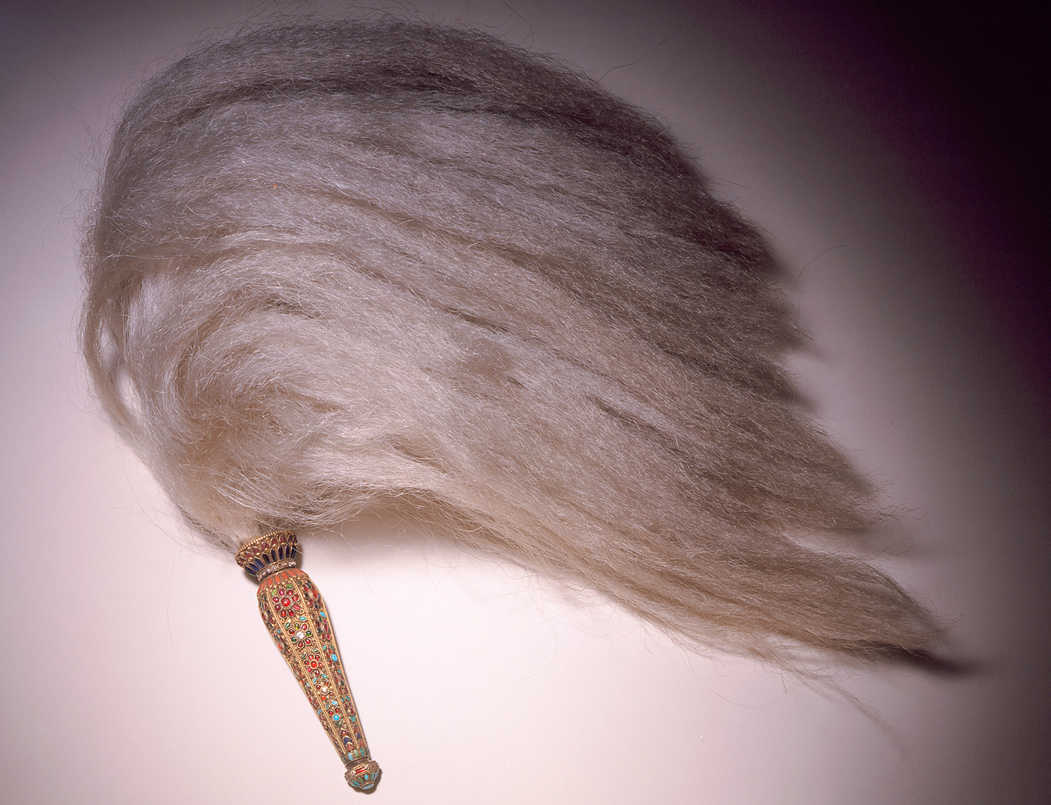 Notable specimens of Indian fly-whisks are part of museum collections around the world. The handle of a chowrie from the Rajput courts of Rajasthan, now housed at the Los Angeles County Museum of Art (LACMA) features kundan work with diamonds set in gold foil, and transparent green enamel. Some specimens of the Sikh ceremonial chowrie or chaur sahib feature handles made of the long, curved horn of the ibex, mounted with silver cups to hold the whisk. One exceptional specimen of a Mughal chowrie from the eighteenth century, housed at the Museum of Fine Arts, Houston, is made entirely from a single elephant tusk — including the fibres themselves, which are created by finely shaving the ivory. Another ivory chowrie from the Mughal court, in the Saint Louis Art Museum collection, features hairs made of slivers of whale baleen, a bristly keratinous filter or sieve found in the mouths of baleen whales. These chowries were likely made by craftsmen based in Murshidabad, the Mughal capital of Bengal, which was home to specialised workshops for ivory and woodworking. A much simpler chowrie from nineteenth-century Assam in Northeast India is housed in the British Museum in London — attributed to the Naga people native to the region, it features a slim, straight wooden handle wrapped tightly in copper wire and mounted with goat hair.