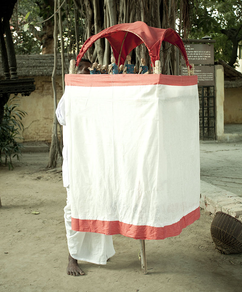 A form of puppetry practised by the Santhal community residing in parts of West Bengal and Jharkhand, chadar badar – also known as chadar bandhani or chadar badani – is distinctive for its portable set-up and intricate mechanics. Approximately six feet in height, the structure used for chadar badar consists of a stand, a stage, puppets and props, all joined together using a complex mechanism of levers and skilled woodwork. A single puppeteer can conduct the entire show, moving the puppets to the music of the accompanying musicians.