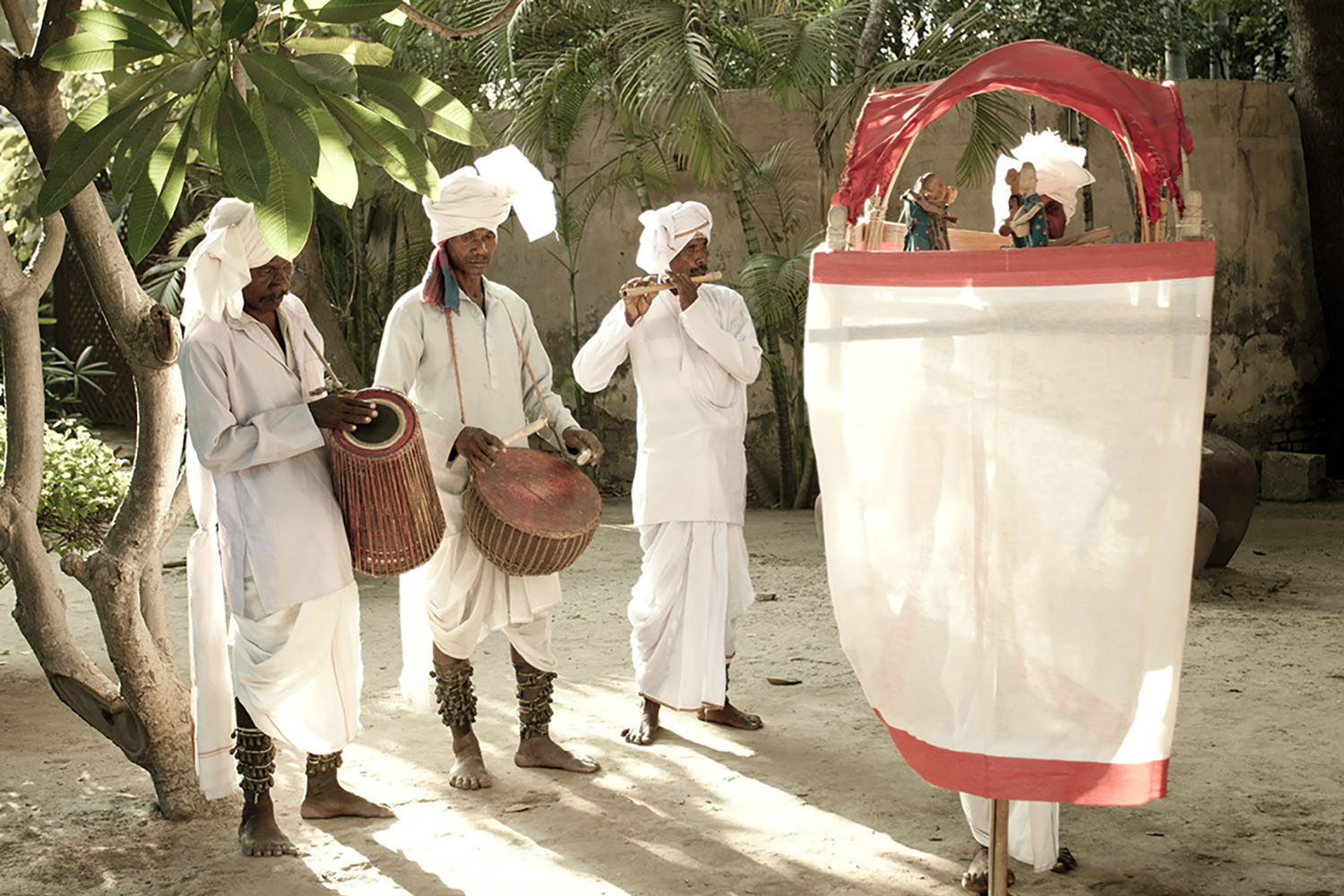 A puppeteer is usually accompanied by musicians playing the traditional instruments of banam (a bowed, stringed instrument with a resonator), tirenya (a flute), and madhol. Performances are usually held during festivals such as Durga Puja, with puppeteers travelling from village to village. According to anthropologists, the repertory of chadar badar draws from Santhali culture as well as other cultures the puppeteers encounter on their travels. Historically, puppetry has also been an important tool of social education among the Santhals.