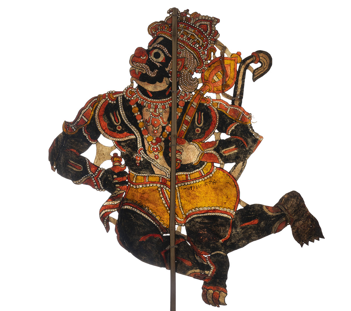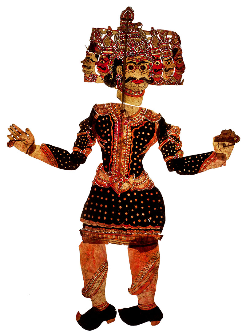 Made from translucent buffalo leather, the puppets of charma bahuli natya measure between 11 and 35 cm. These are lightly painted with vegetable-based pigments and were traditionally made without joints or perforations. Newer puppets, however, may be perforated. A bamboo split attached vertically along the length of the puppet is used to hold it up during a performance. When required, a moveable arm is pinned onto a puppet and is manoeuvred by the puppeteer using a second split. A complete set of puppets can include up to sixty five characters.