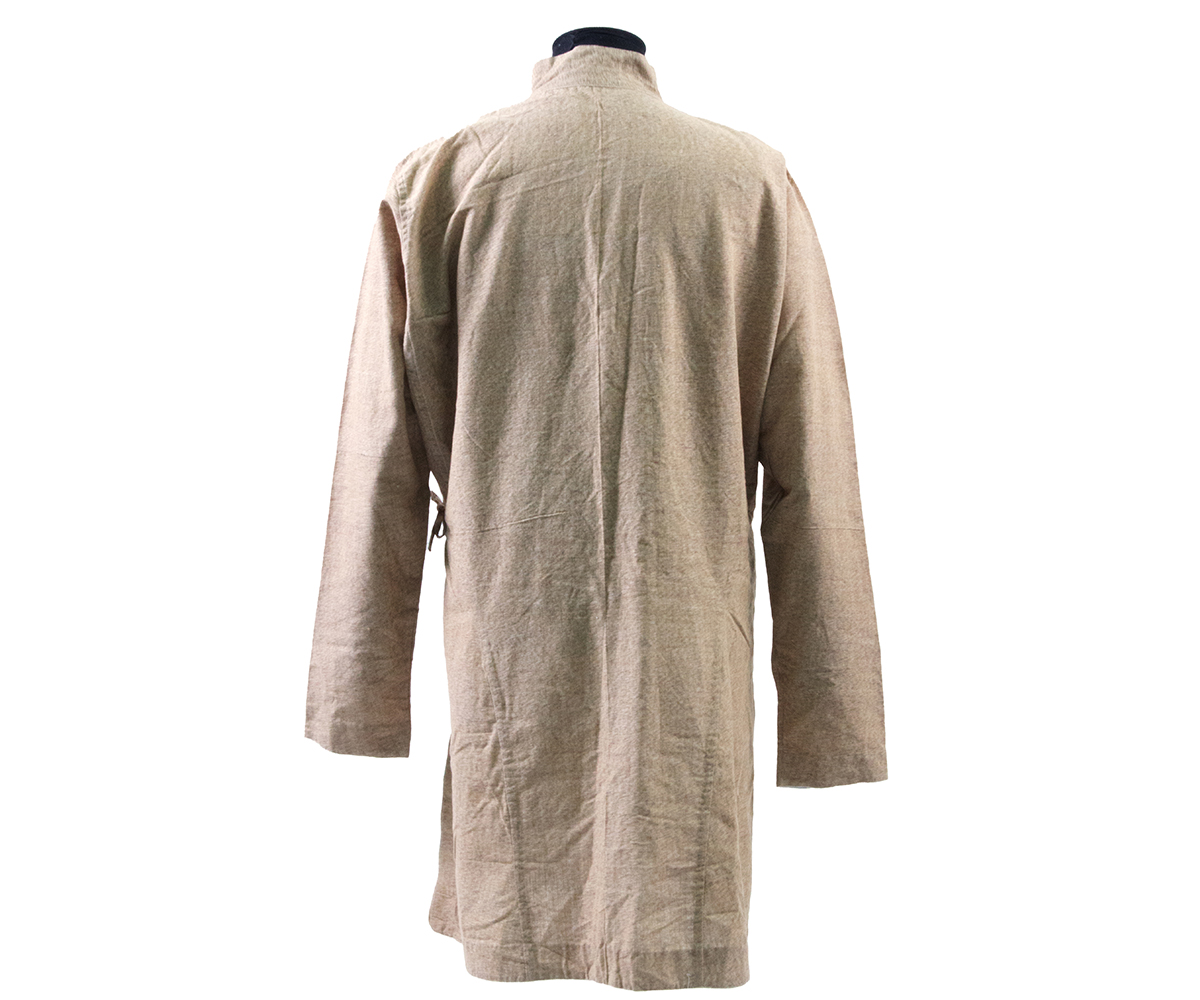 The daura, also known as the labeda, while similar to the chaubandi in design, is significantly longer, reaching the mid-thigh, and always has full sleeves. Like the chaubandi, it wraps across the torso for a closed neck. Its eight tie-cords lead to it being considered lucky in some contexts, as the number is auspicious in local cultures. Dauras are usually made in solid, muted colours, with little regional variation, though the hem often features a patterned border. The daura is typically worn with a suruwal — drawstring trousers similar to the pyjama — and a Dhaka topi, with a patuka wrapped around the waist. A waistcoat and/or blazer are frequently worn over it.