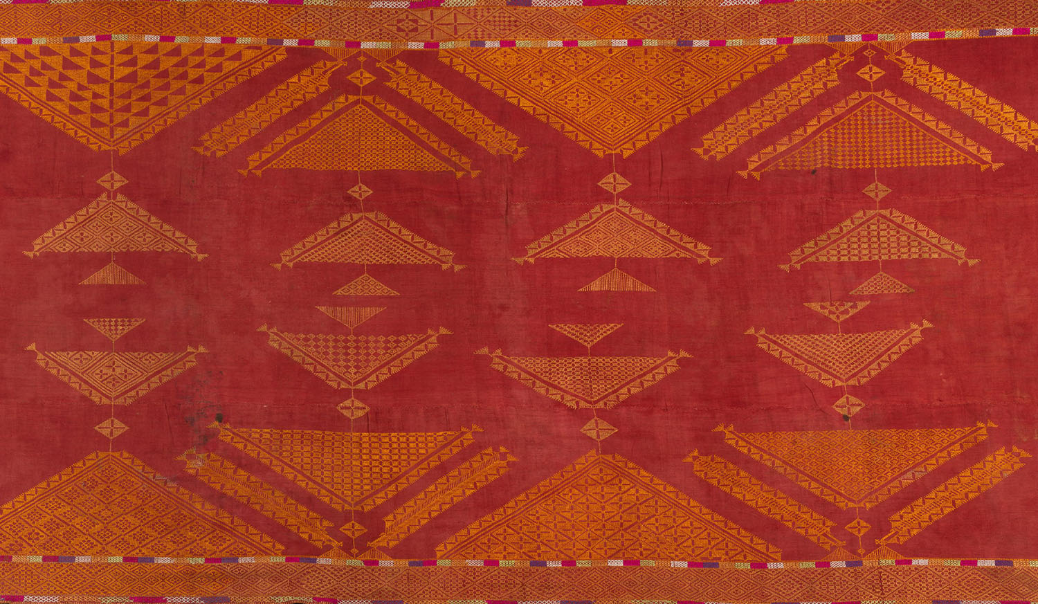 The chope’s design is composed of geometric forms, mainly triangles and lattice formations, with the occasional inclusion of a peacock or cow motif. Thin lines in the pattern are embroidered in any colour other than yellow or red as a nazarbuti motif, believed to protect the bride from misfortune or malevolent stares. The embroidery is applied using a double running stitch, making the design visible on either side of the chope. The decoration is denser towards the longer sides of the chope than the middle, and the short sides lack borders. This results in a red stripe that runs lengthwise through the middle of the chaddar, narrow through the body and widening at each end, meant to signify endless fortune for the bride wearing the chope.