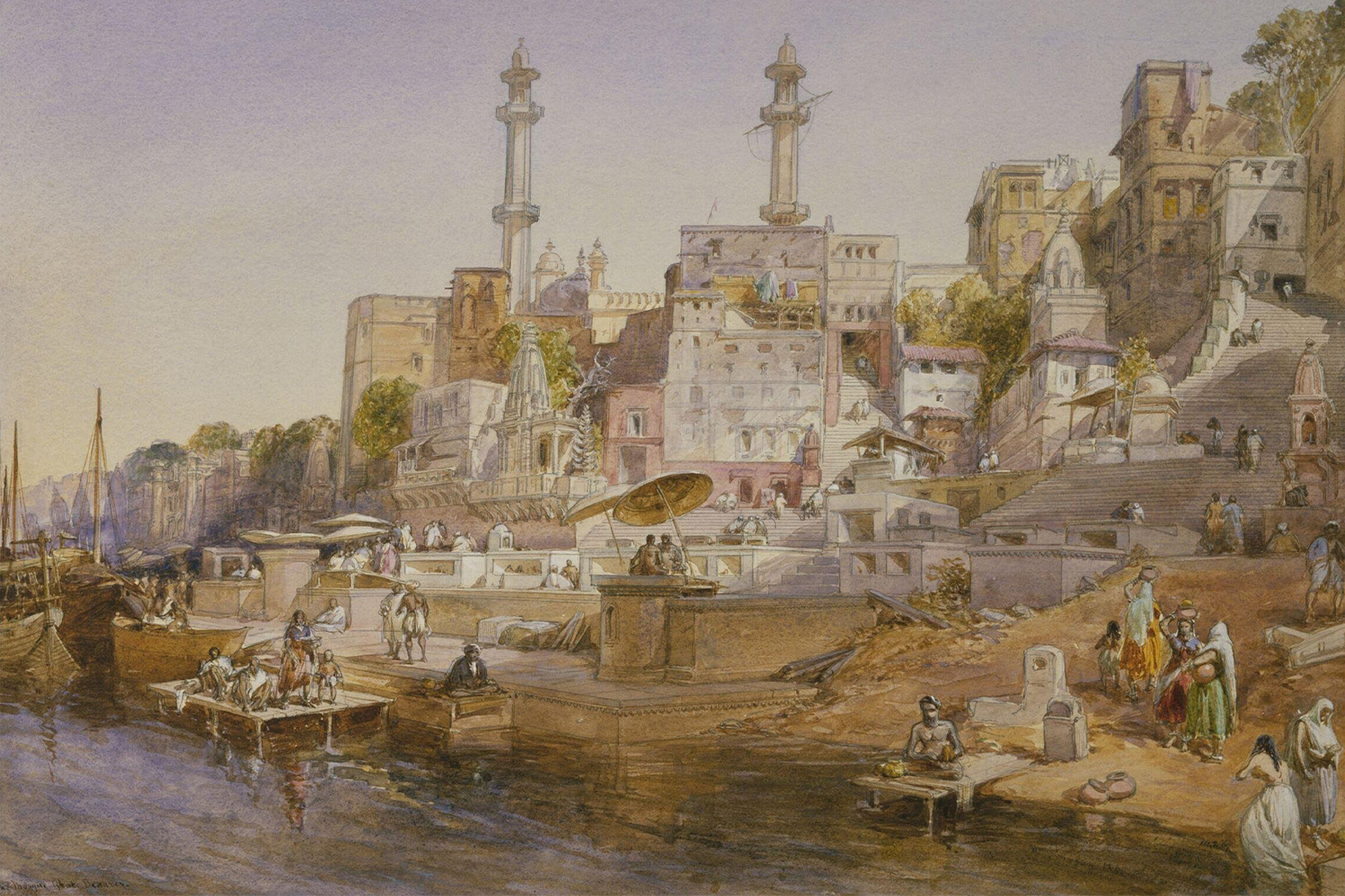 The mosque of Aurangzeb and Panchganga ghat from the Ganges, Benares; William Simpson, Varanasi, Uttar Pradesh, India; 1860; Pencil, ink and watercolour; 36 x 52 cm; Victoria and Albert Museum, London