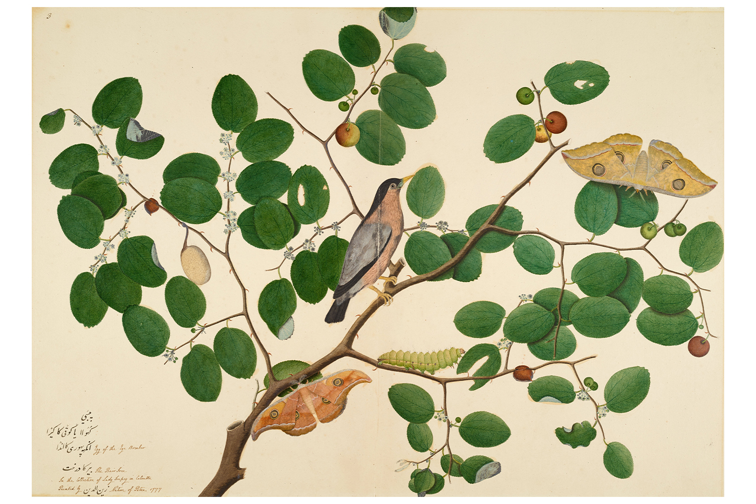 Brahminy Starling with two Antheraea Moths, Caterpillar, and Cocoon on an Indian Jujube tree; Sheikh Zain ud-Din; c. 1780; Opaque colour and ink on paper; 76.2 x 96.52 cm; Wikimedia Commons