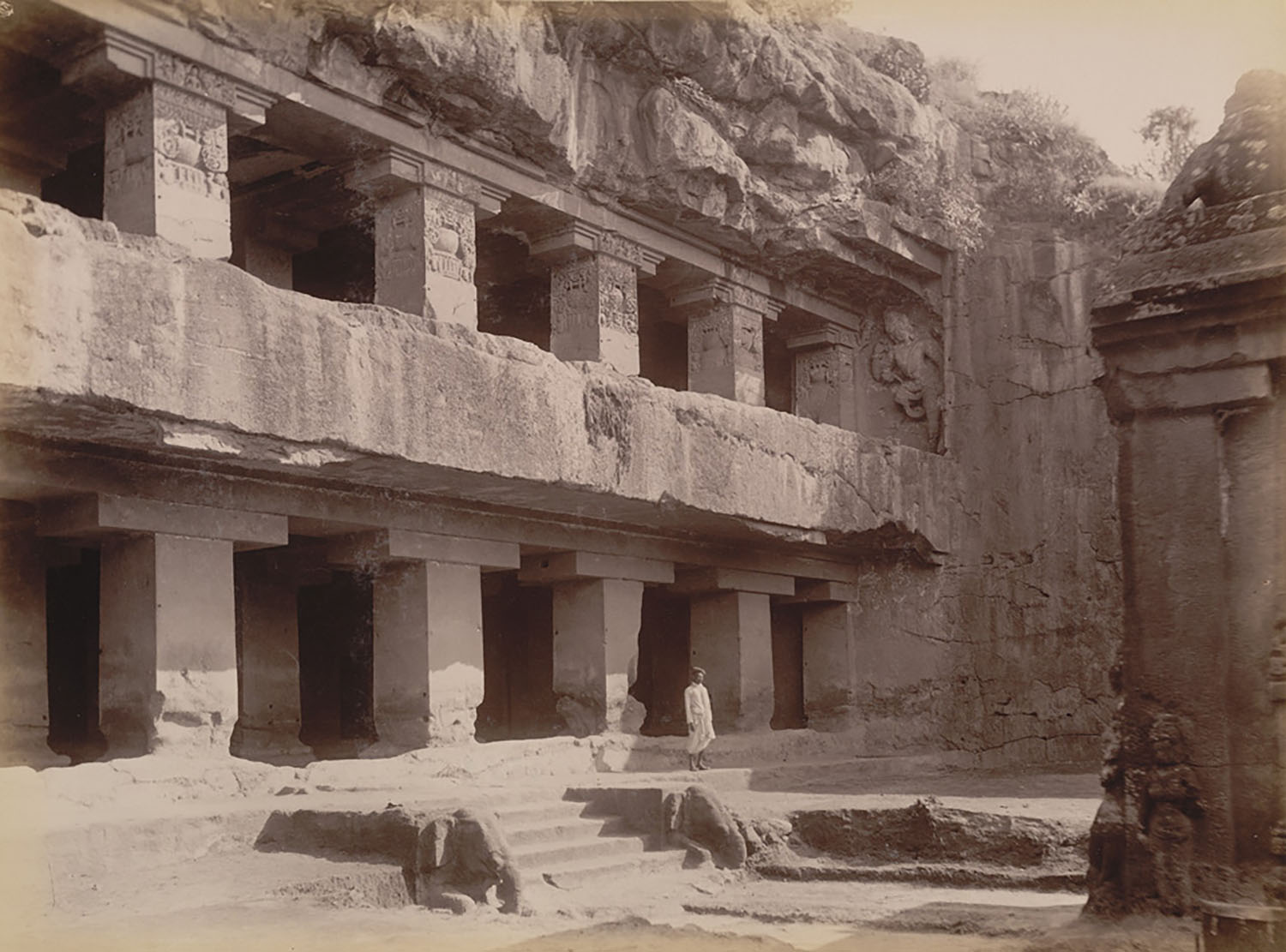 The cave proper is two storeys tall; the upper storey consists of a mahamandapa containing forty-two ornamented pillars in six rows, with large sculptural niches along the northern and southern walls. An antechamber, leading to a garbhagriha containing a Shiva lingam, is carved into the eastern wall; it is flanked by two sculptural niches on either side. The deep court of the mahamandapa is a distinctive feature of later caves at Ellora. The ground level is supported by fourteen plain pillars and a number of cells, features similar to those of the Buddhist Caves 11 and 12 in the Ellora complex; seated Buddhas are also depicted on the bracket-capitals of the upper storey. This has led several scholars to suggest that the Dashavatara cave was initially excavated as a Buddhist shrine, being converted into a Shaiva shrine before its completion by the Rashtrakutas.