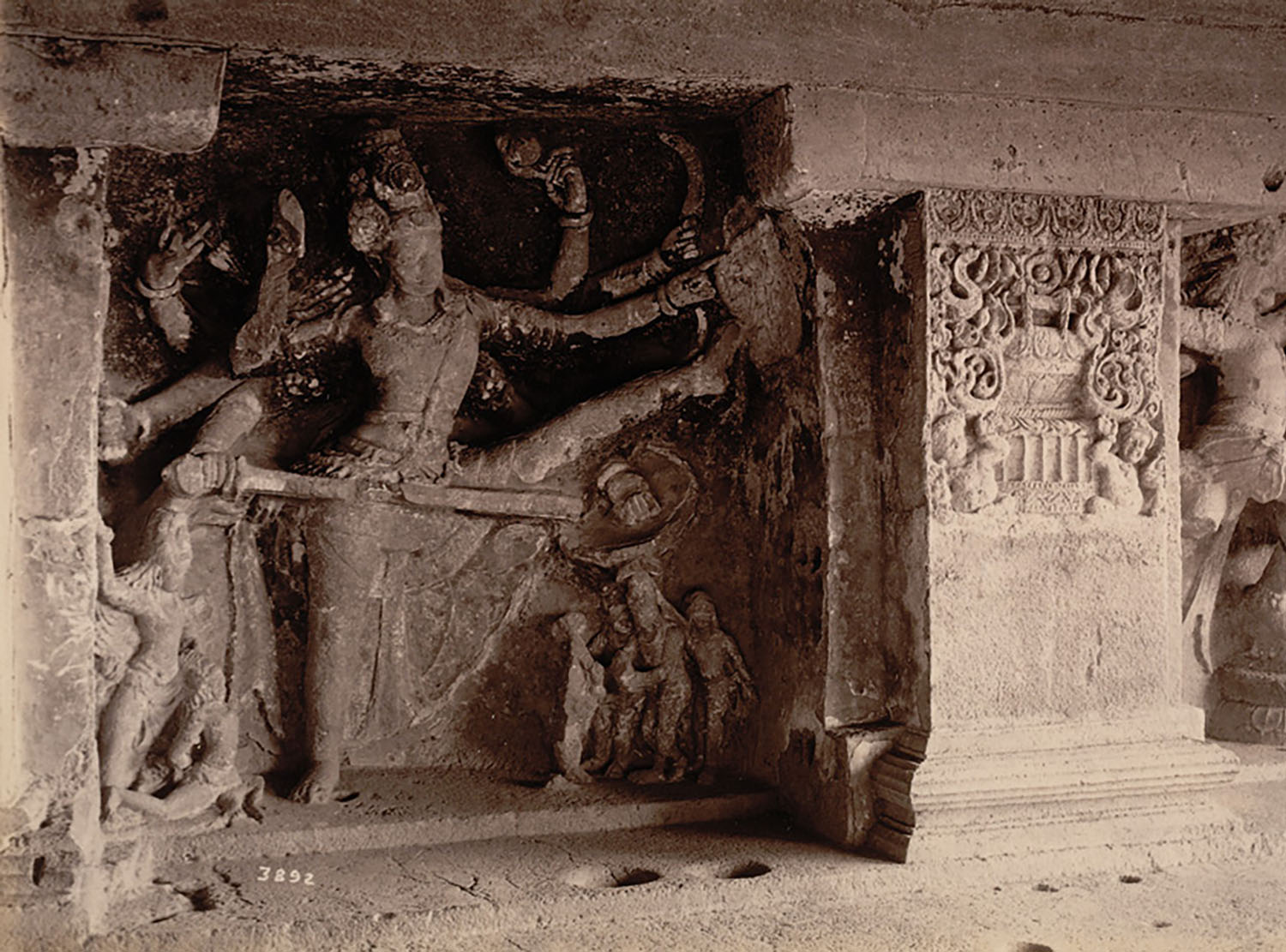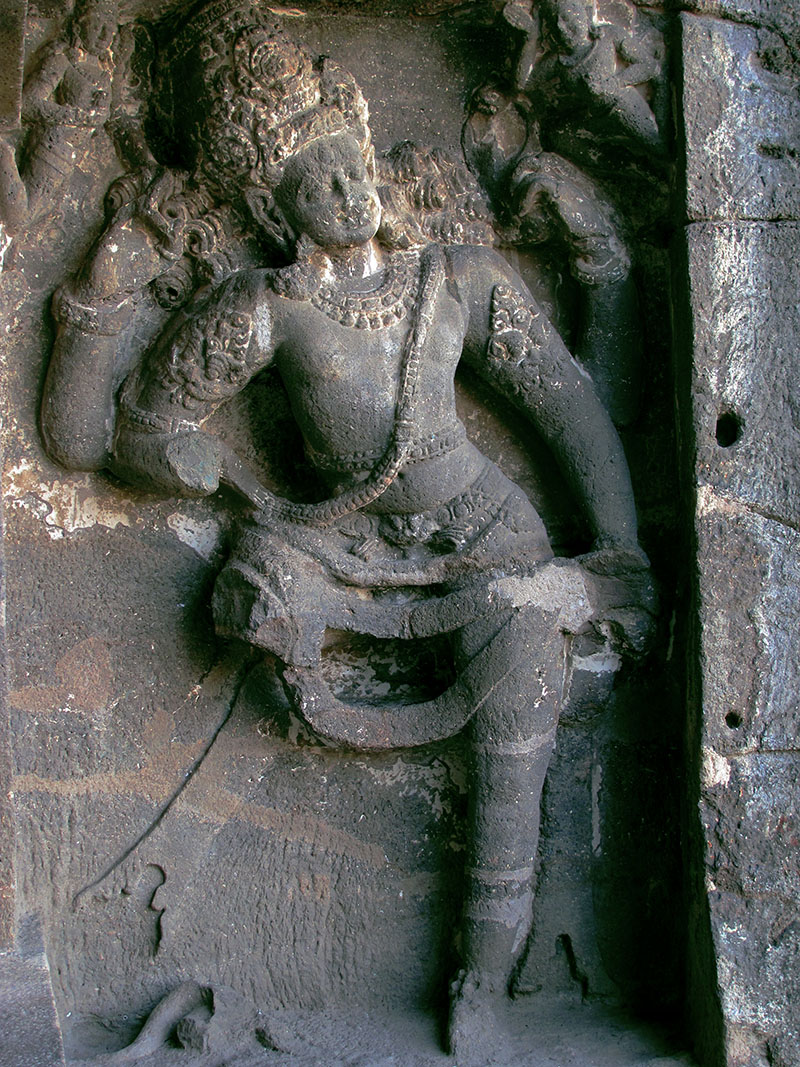 The sculptures in the Dashavatara cave usually depict multi-armed deities in dynamic poses, with exaggerated, expressive hands, faces, and feet. The vertical compositional principle favoured in earlier caves at Ellora and at contemporary Deccan temple sites such as Pattadakal is replaced with an emphasis on the diagonal. This can be seen in the Shiva Dancing in Lalita and the Narasimha-Hiranyakashipu panels, where the gods’ bodies and arms are positioned around diagonal axes, imparting a sense of movement and energy to the sculptures. The volume of the sculptures is variable and fluid; some panels are carved within deep cavities, giving a sense of envelopment by negative space and heightening their dramatic impact.