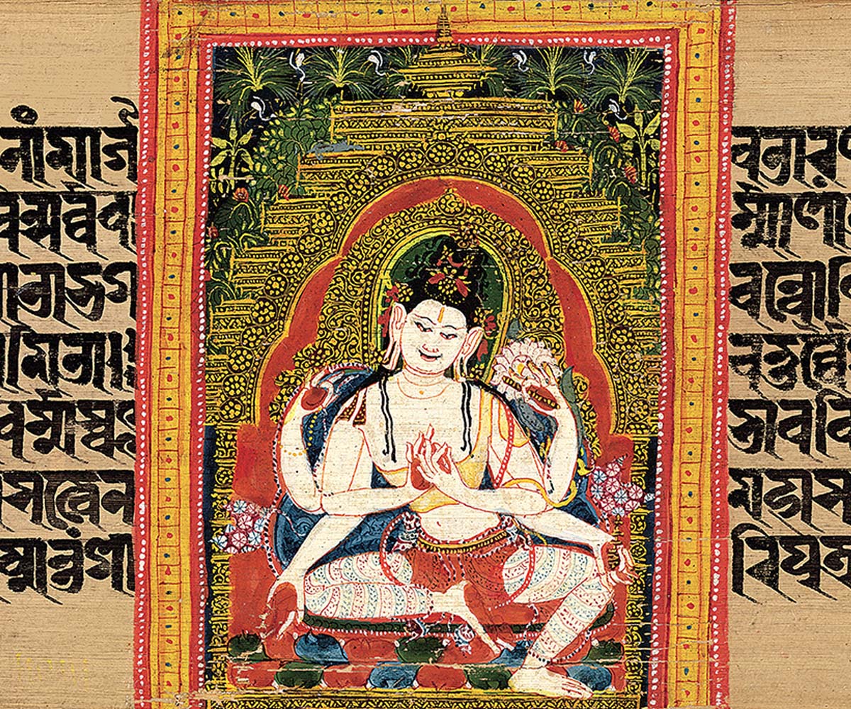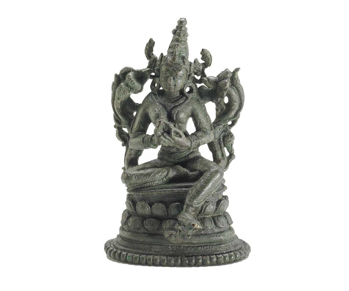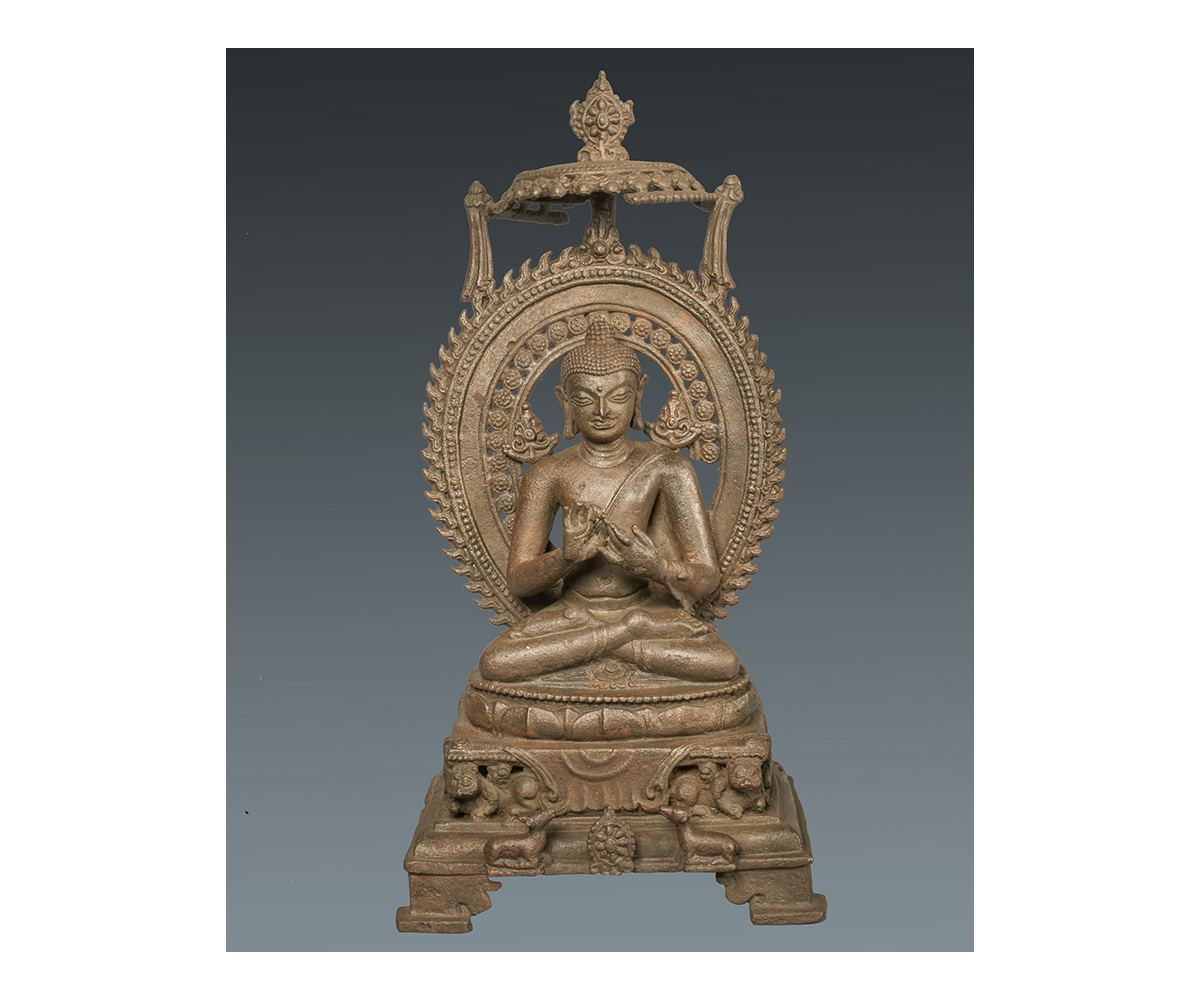 One of five common mudras or sacred gestures in Buddhist iconography and practice, the dharmachakra or ‘wheel of law’ mudra represents the Buddha’s first sermon at Sarnath. The teachings of this sermon are considered to have set the wheel of dhamma or dharma in motion, dispelling ignorance with the wisdom of reality. Both the hands are held at the chest level, with the right above the left and the thumbs of each hand touching the respective index fingers to form a circle. The tips of the left and right thumbs and index fingers in turn touch each other in such a way that the palm of the left hand faces inwards, while that of the right hand faces outwards. Among the five celestial Tathagata or Dhyani Buddhas, considered to represent cardinal qualities, the dharmachakra mudra is associated with Vairochana.