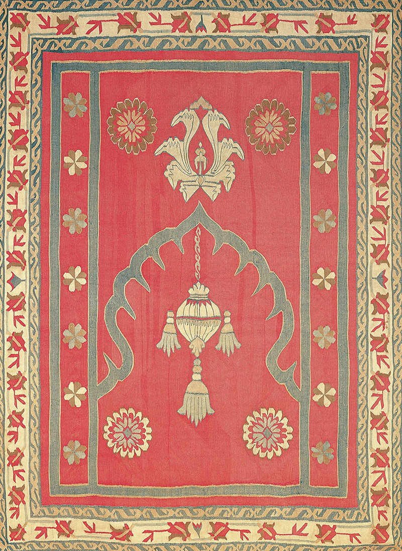 The earliest evidence of rug-like floor-coverings is from a 200–400 BCE fragment of woollen carpet with a tapestry base weave excavated from the Krorainic region of Western China. The material evidence is corroborated by documents in Kharosthi that refer separately to ‘rugs’ and ‘carpets’ from the region. The 200-300 CE treatise of the Arthashastra refers to different kinds of floor coverings, including the rug or pravaraka, that are made from the hair of animals. A tenth-century travelogue by Arab geographer al-Maqdisi makes a more definitive reference to rugs (called busut), specifically from the Sindh region of British India (now of Pakistan). Pictorial references to rugs are seen in sixth-century Ajanta murals; Sultanate period manuscript paintings — such as the Bustan of Sa’di (c. 1500); the sixteenth-century Padshahnama; and sixteenth-to-eighteenth-century Mughal and Deccan miniatures from the St. Petersburg Muraqqa. Later material evidence of a flat-weave Indian rug is provided by a seventeenth-century fragment from the Amber Palace in Rajasthan housed in the Calico Museum; a prayer rug dated to 1686 and from the Jama Masjid of Bijapur; and a dhurrie sample from the karkhana (workshop) of the Nizam of Hyderabad, attributed to 1700. These remains along with manuscripts from the period attest to the use of rugs for secular and religious purposes and to the existence of storehouses or farrashkhanas for palace dhurries in the various princely states.