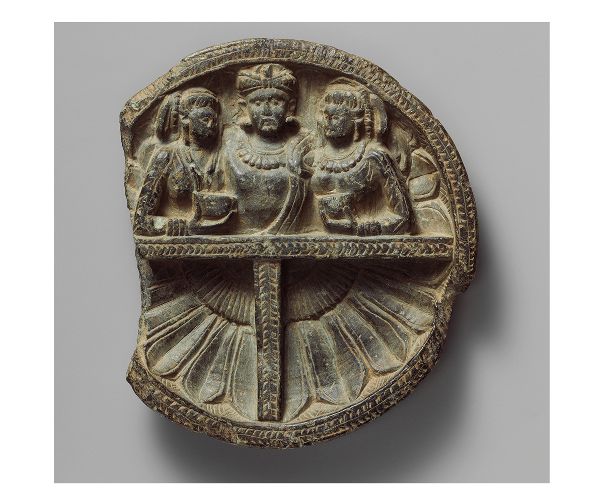 Dish with Drunken Herakles Embracing Two Women; Gandhara, present-day Pakistan; c. 1st century CE; Schist; 15.6 cm; The Metropolitan Museum of Art
