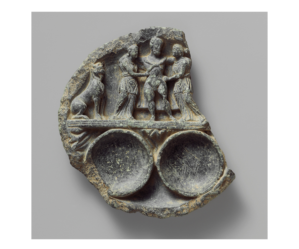Dish with the Drunken Hercules Supported by Two Women and Flanked by a Lion; Gandhara, present-day Pakistan; c. 1st century CE; Schist; 12.4 cm; The Metropolitan Museum of Art