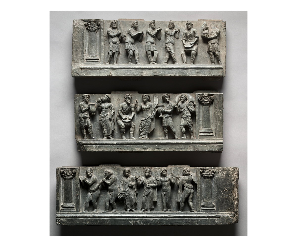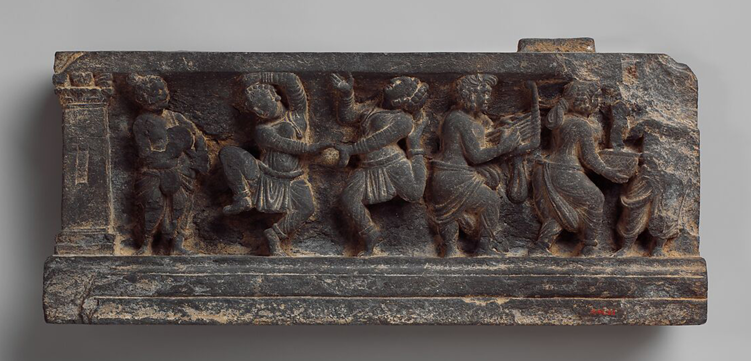 Dionysian Scene with Musicians and Dancers; Gandhara, present-day Pakistan; c. 1st century CE; Schist; 17.2 x 40.6 cm ; The Metropolitan Museum of Art