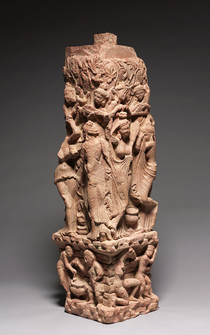 As with most Gandharan art, there is some ambiguity around the influences for the inebriated figures, which seem to simultaneously draw on Hellenistic, Roman, Egyptian or Ptolemaic, Hindu, Buddhist and Zoroastrian cultures in both style and subject matter. While some scholars consider the scenes to be an aspect of the cult of Dionysus — and therefore, a product of Hellenistic influence on Gandharan art — others highlight a more indigenous source for the images in the ancient cults of yakshas and yakshis, who were ritually offered meat and alcohol and were also custodians of amrita, or the elixir of eternal life, which was held in chalices.