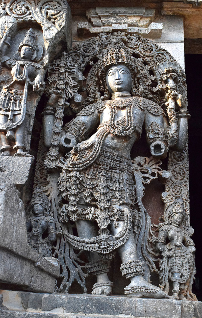 Dwarapala may be depicted kneeling or standing, with one or multiple pairs of arms and with ferocious or calm visages. Their headdresses can range from matted locks to horned headdresses, or kiritamukuta, and their hands are depicted in a variety of mudras or gestures. The iconography of dvarapala statues also borrows elements from the deity they are stipulated to protect. For example, Shaivite and Vaishnava dvarapala statues may carry symbols emblematic of Shiva and Vishnu in their hands, and certain kinds of Shaivite dvarapalas may even be depicted holding clubs and with protruding teeth and horns. Similarly, in Mahabalipuram, a shrine believed to be dedicated to Brahma has dvarapala figures depicted with ankle-length garments and matted locks, holding a flower or a vessel.