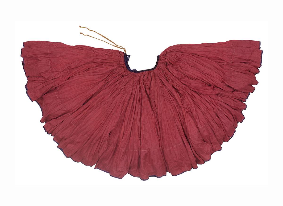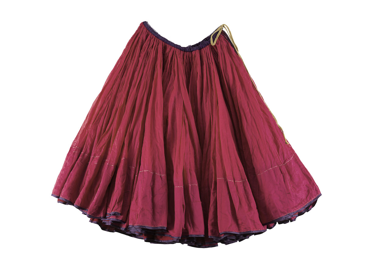 Worn by women across North India, the ghagra is a gathered, skirt-like garment stitched with a single, vertical seam. It is tightly secured at the waist with the use of a drawstring or nada, also known as the izarband, which makes the fabric fall in vertical pleats and flare out at the bottom. The name ghagra is believed to have derived from the word gher, meaning “flare” or “girth.” It is also known as chaniyo or chania in Gujarat and Rajasthan, possibly deriving from the word charan, meaning “feet,” since the skirt falls till the feet of the wearer.