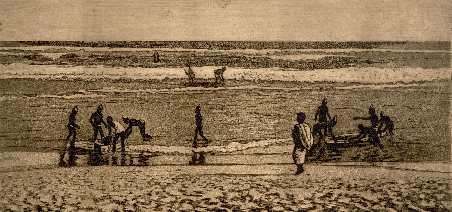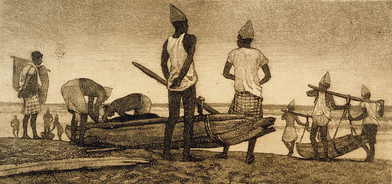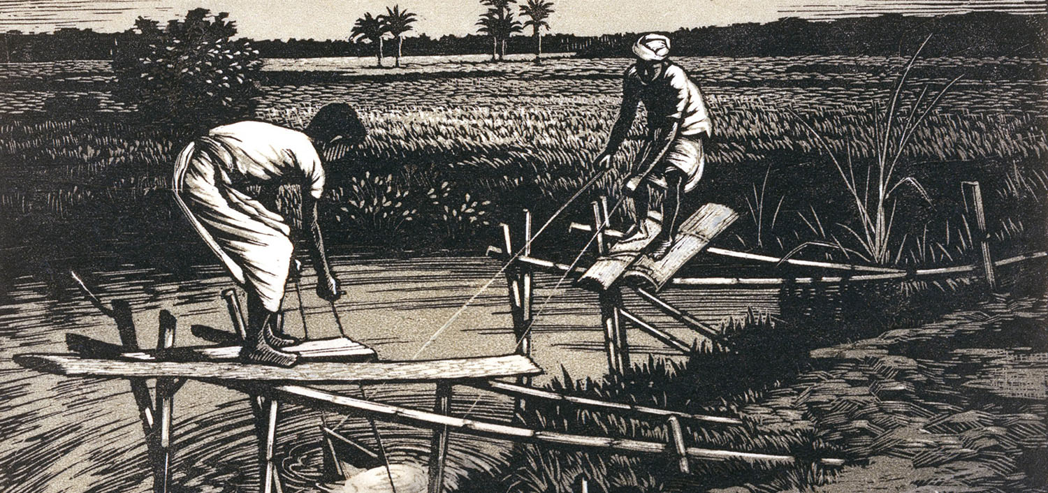 Das adopted printmaking at a moment in history when painting was believed to be the superior artform. His repertoire ranged from wood engraving, to etching, to linocut, which he employed to capture rural Bengali life as well as the landscapes, seascapes, and flora and fauna indigenous to the Bengal region. In 1950, Das published Bengal Village in Wood Engraving, a volume of prints that documented the gradual urbanisation of the Bengali landscape. Other works included in this publication, such as Towards the Market (1950) and Fishing (1950), balance the rural and urban aspects of Bengali society and juxtapose human activity with the natural beauty of the landscape.