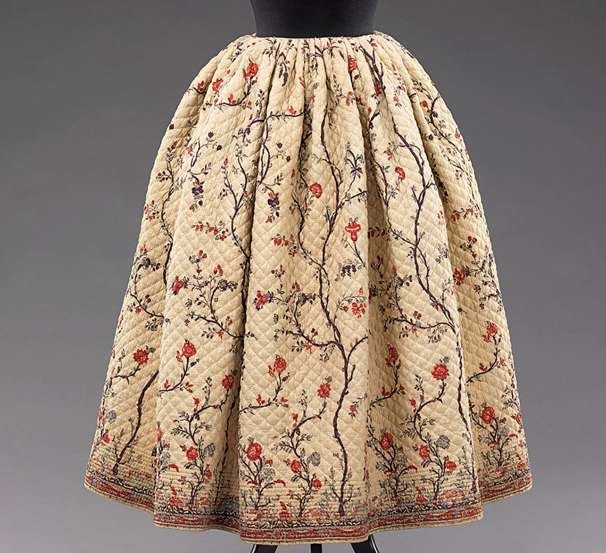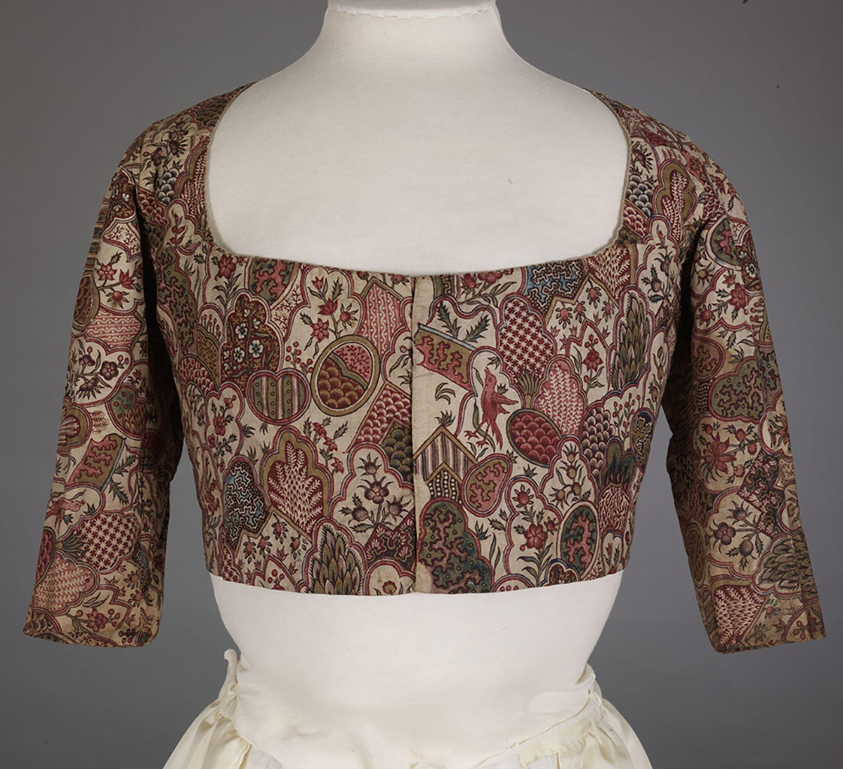 Portuguese traders operating along the eastern and western African coasts in the seventeenth and eighteenth centuries first introduced Indian chintz to Europe. European colonial powers did not yet dominate Asian and African markets, or the production of goods, at this time and thus the printed calico was a novelty fabric in great demand. The cloth was not only lighter, softer and more brightly coloured than the woolen fabric commonly used in Europe at the time, but was also inexpensive to produce and purchase. It became even more affordable after the French and British East India Companies took over the trade in the late eighteenth century. Indian chintz was thus used in Europe for a variety of clothing, from elaborate dresses to everyday skirts and undergarments. Hand-painted fabrics were the most expensive, while block-printed ones were more affordable for working-class buyers.