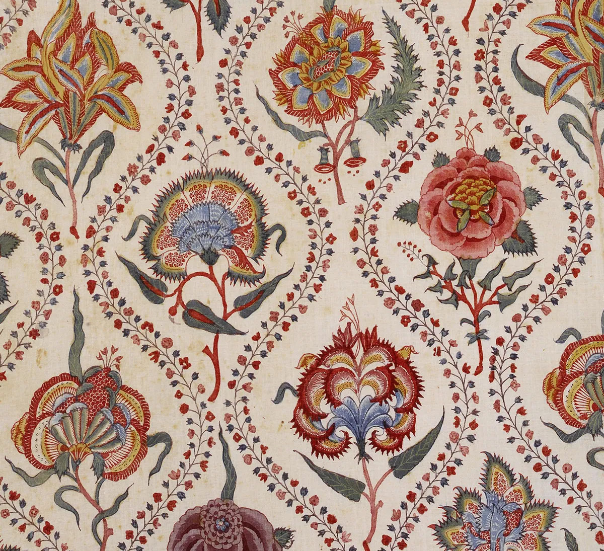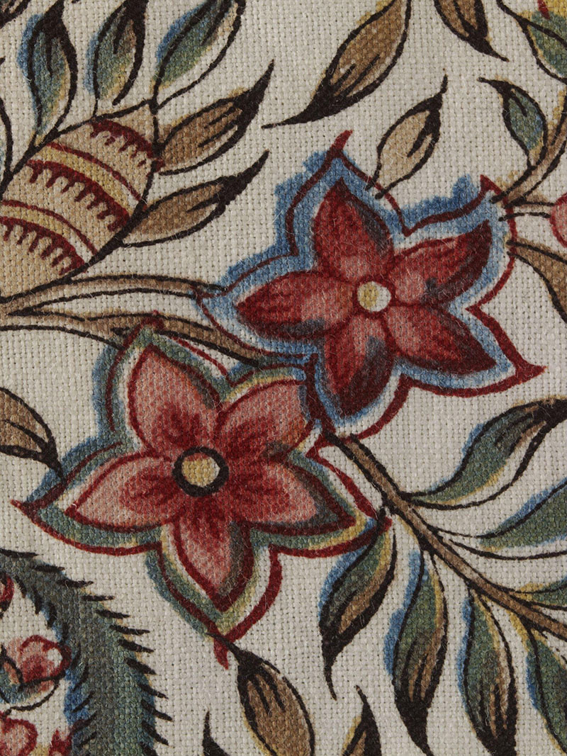 While indiennes and English chintz fabrics are very similar, and the terms are often used interchangeably, there remain some key differences. English chintz is glazed and thus has a sheen, while French indiennes retain the plain cloth’s original texture. Indiennes also use garance or red dye as a ground more often than indigo, whose production and trade was controlled by the British Crown. The Paisley motif is also less commonly used in French indiennes. Instead, print motifs typically include natural imagery from the French countryside, such as olive and lemon branches, vines, lavender sprigs and cicadas, usually paired with images of flowering shrubs. Sunflowers and mimosas, introduced to Europe from Asia and Africa around the same time as indiennes themselves, can also be found. While traditional indienne patterns consist of two-dimensional, undulating and uniformly spaced motifs, advancements in dyeing have allowed for more realistic imagery with shading and subtler colours to be printed on indiennes, although these have historically been less popular.