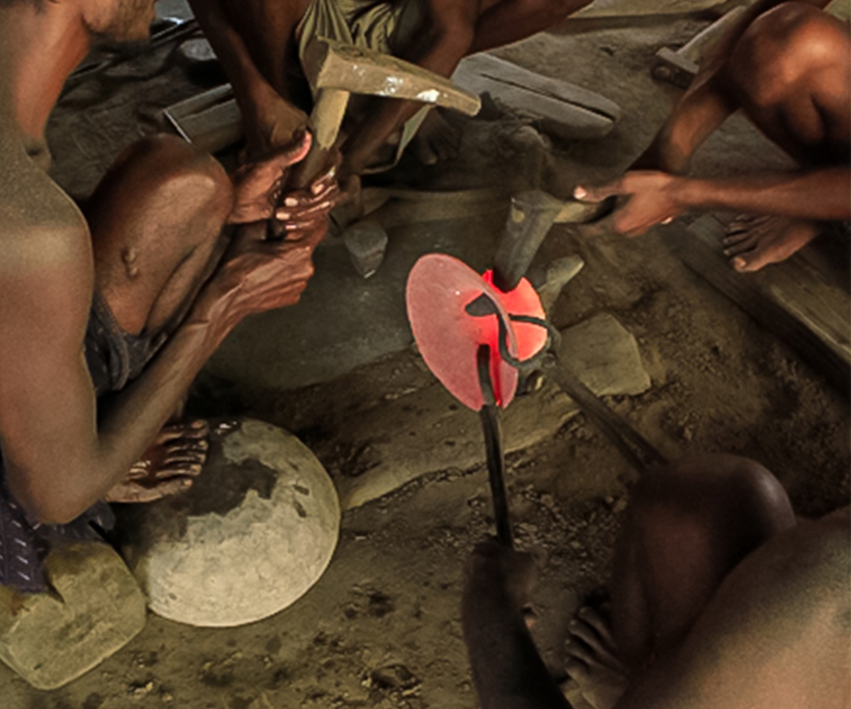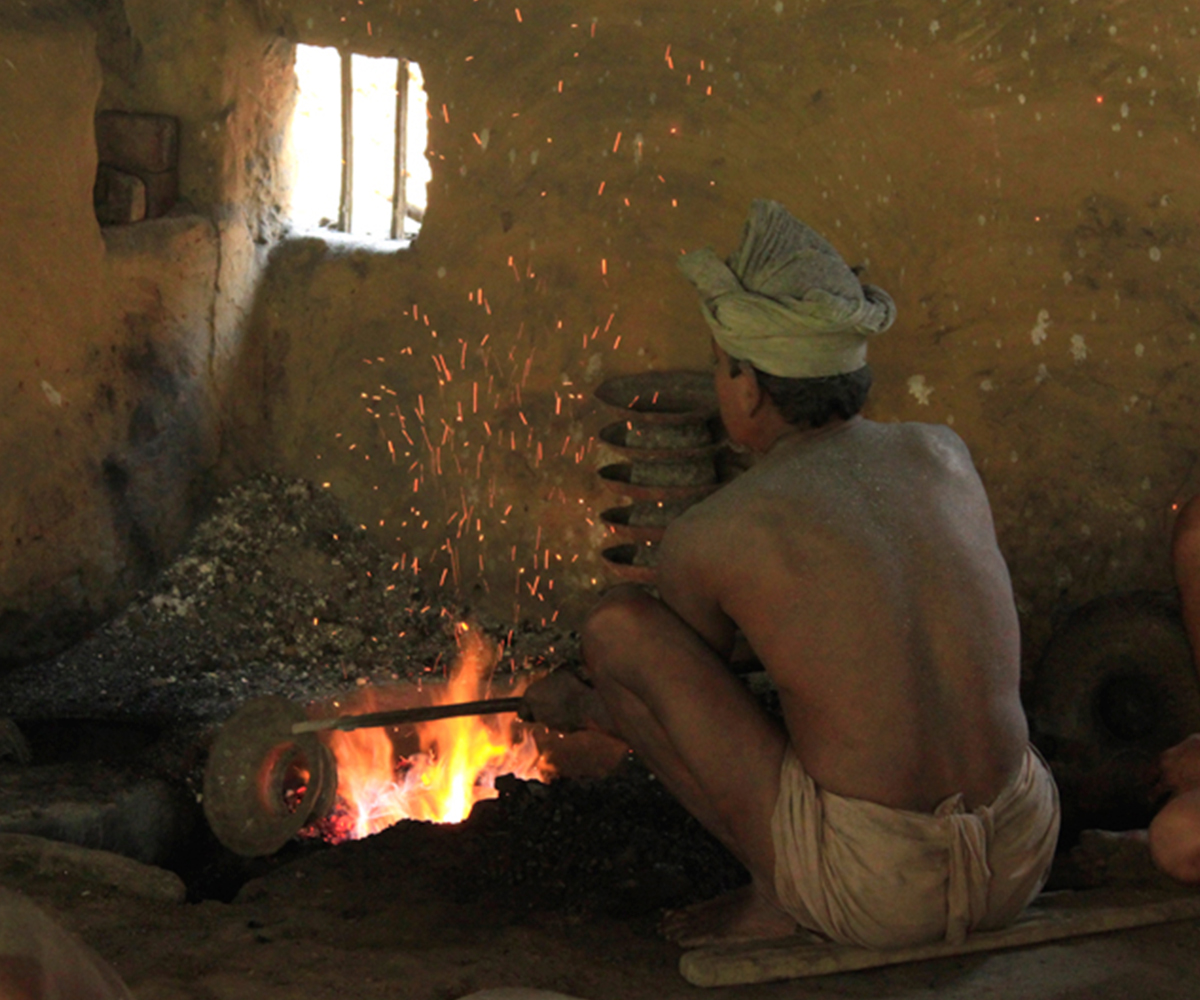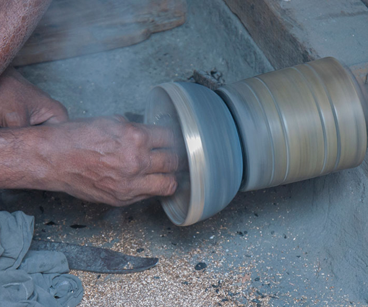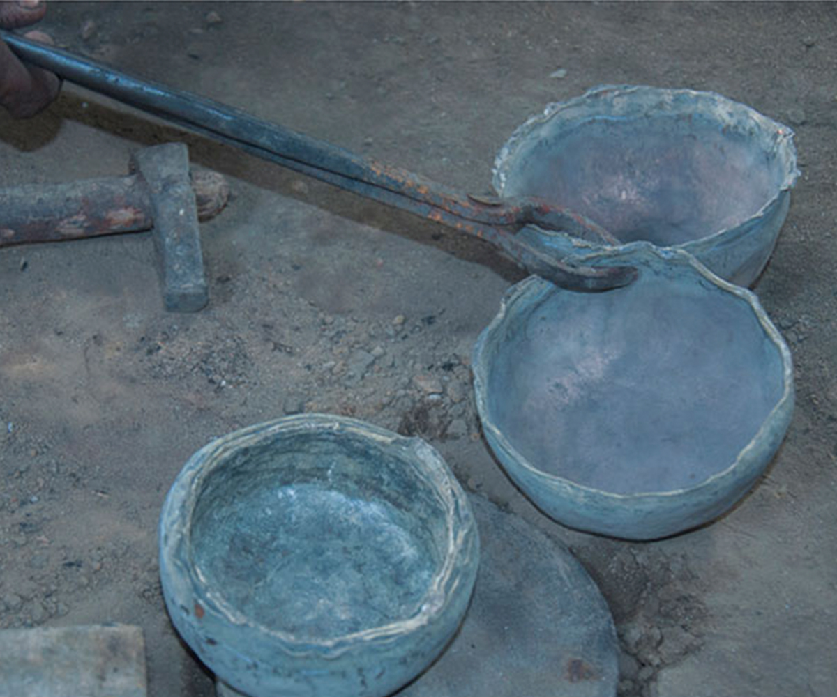 Making brass and bell metal ware is a labour intensive, highly collaborative process. It requires close coordination among a number of artisans with different levels of specialised skill, each performing a specific role in the production process. The first step involves preparing the alloy itself, often by melting down metal scraps in a furnace, or bhatti. In a crucible (koi), copper is mixed in a precise proportion with zinc (to produce brass) or tin (to produce bell metal) to obtain the molten alloy. This is either cast by pouring into a mould, or allowed to cool in earthenware dishes as disc-shaped ingots, which are then forged into shape using a hammer or hatudi. In the next step, three or four artisans rhythmically hammer down the ingot on a stone surface while another turns it continually to ensure even thickness, as it is repeatedly heated on an open furnace to keep the metal malleable. The process continues until the desired size and approximate shape is obtained, with newer ingots layered in with the partially beaten one so that multiple bowls or plates can be produced simultaneously. The forged layers are then separated using tongs or pincers (sandasi) to be individually shaped and finished using hammers, scrapers (lihini) and files (ruha or ugha). A master craftsperson carries out the final shaping using a light hammer, followed by polishing and buffing while turning the product on a lathe (kunda), and sometimes embellishing it with decorative etching.