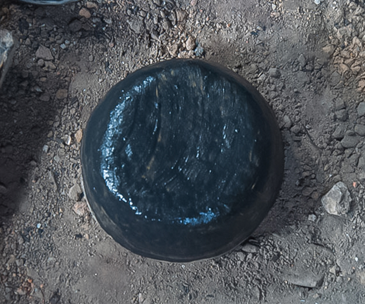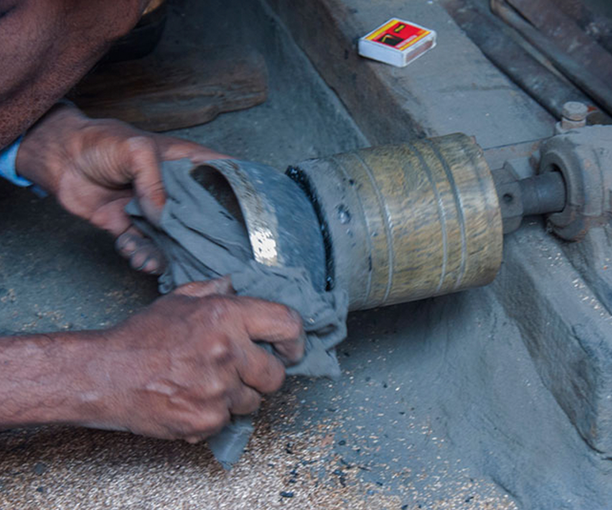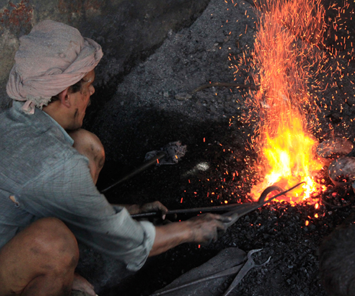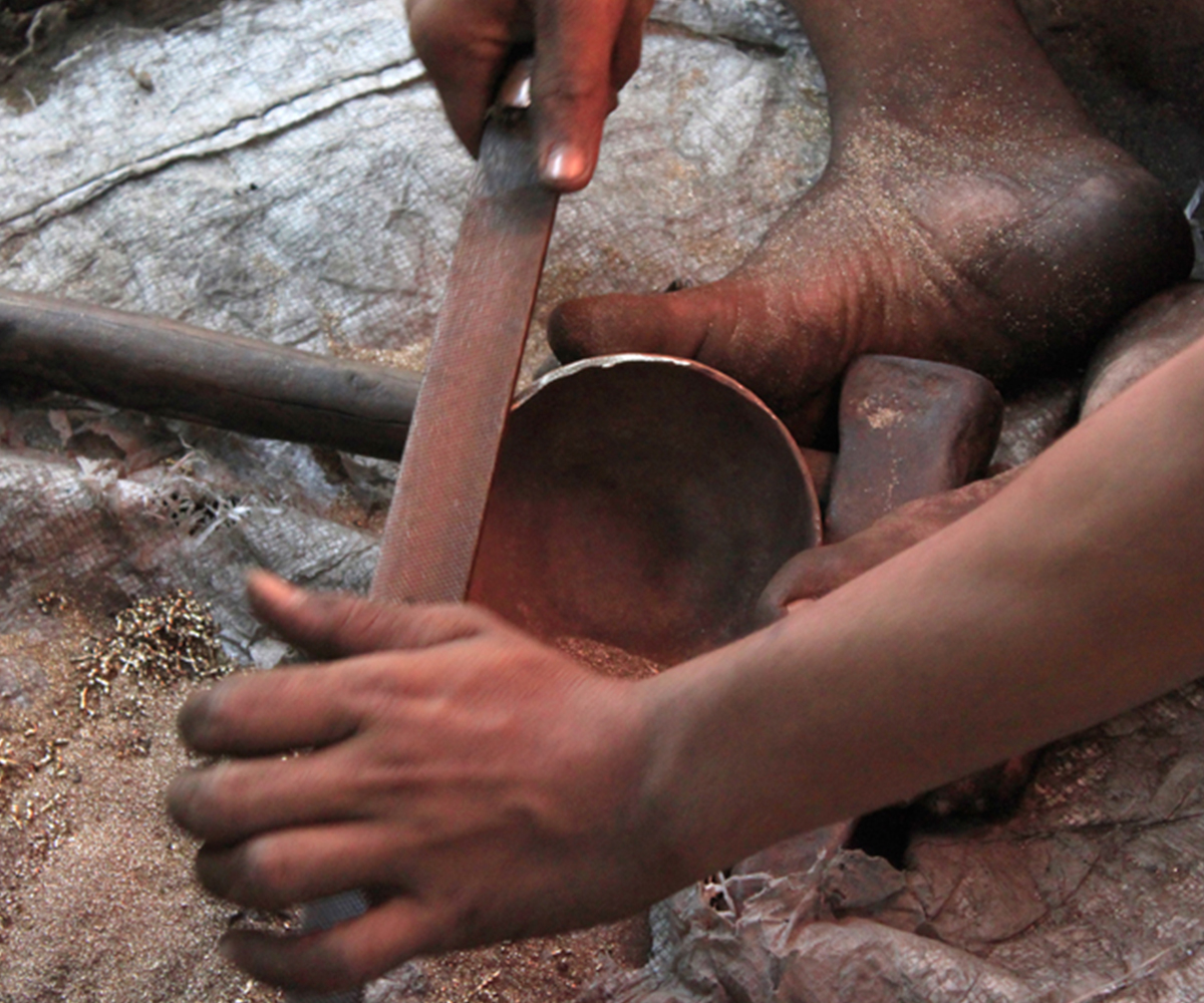Making brass and bell metal ware is a labour intensive, highly collaborative process. It requires close coordination among a number of artisans with different levels of specialised skill, each performing a specific role in the production process. The first step involves preparing the alloy itself, often by melting down metal scraps in a furnace, or bhatti. In a crucible (koi), copper is mixed in a precise proportion with zinc (to produce brass) or tin (to produce bell metal) to obtain the molten alloy. This is either cast by pouring into a mould, or allowed to cool in earthenware dishes as disc-shaped ingots, which are then forged into shape using a hammer or hatudi. In the next step, three or four artisans rhythmically hammer down the ingot on a stone surface while another turns it continually to ensure even thickness, as it is repeatedly heated on an open furnace to keep the metal malleable. The process continues until the desired size and approximate shape is obtained, with newer ingots layered in with the partially beaten one so that multiple bowls or plates can be produced simultaneously. The forged layers are then separated using tongs or pincers (sandasi) to be individually shaped and finished using hammers, scrapers (lihini) and files (ruha or ugha). A master craftsperson carries out the final shaping using a light hammer, followed by polishing and buffing while turning the product on a lathe (kunda), and sometimes embellishing it with decorative etching.