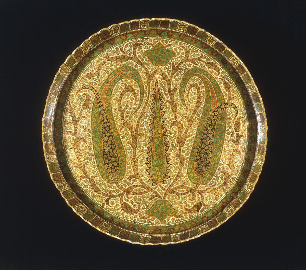 A papier-mache craft that originated in the Kashmir region, kari-kalamdani is named after kalamdan, or pen stands, that were first created with this craft. In the thirteenth century, Kashmiri paper or khosur kagaz, was a sought-after commodity for its fine quality, leading to a demand for kalamdans which were decorated with kari-kalamdani. Kari-kalamdani is also referred to as kar-e-munakashi, or the art of decoration.