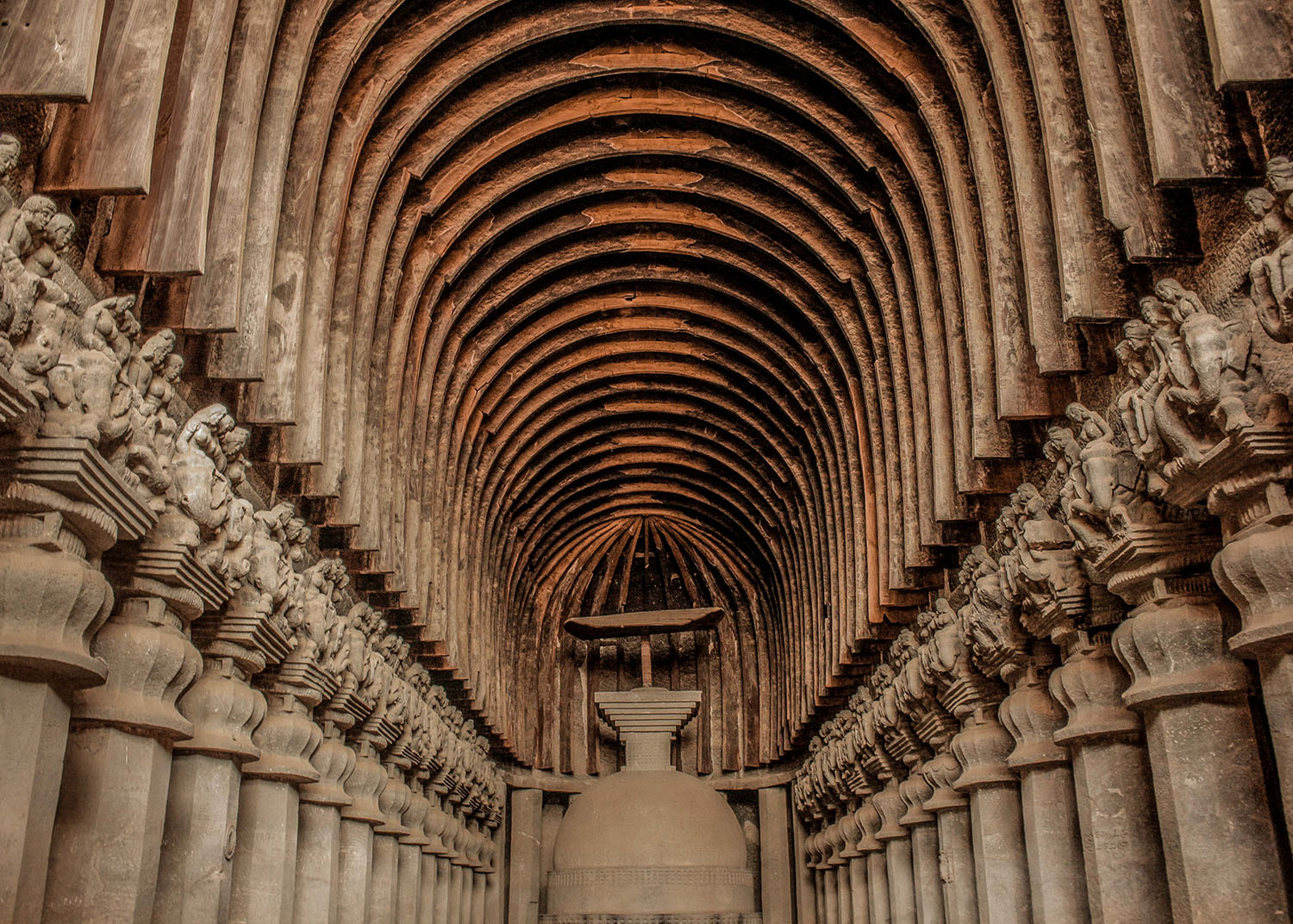 The Karle chaitya is carved into a mountain-side, with its apsidal chamber extending 124 feet into it, and a barrel-vaulted roof 46 feet high. The apsidal cave consists of a broad central nave with two narrow aisles demarcated on either side by a row of fifteen octagonal pillars. These pillars rise out of pot-shaped bases and have capitals depicting individuals or couples riding on elephants and horses. They bear inscriptions recording details of donations and gifts. The stupa is at the deep centre of the apsidal protrusion, with seven octagonal shafts behind it and to the sides. The yasti-chattra (parasol) atop it is made of wood, and still intact. Its underside is carved with concentric circular motifs and a multi-petalled lotus. The site originally made considerable use of wood in its architecture, as suggested by the remnants of wooden ribs on the barrel-vaulted roof.