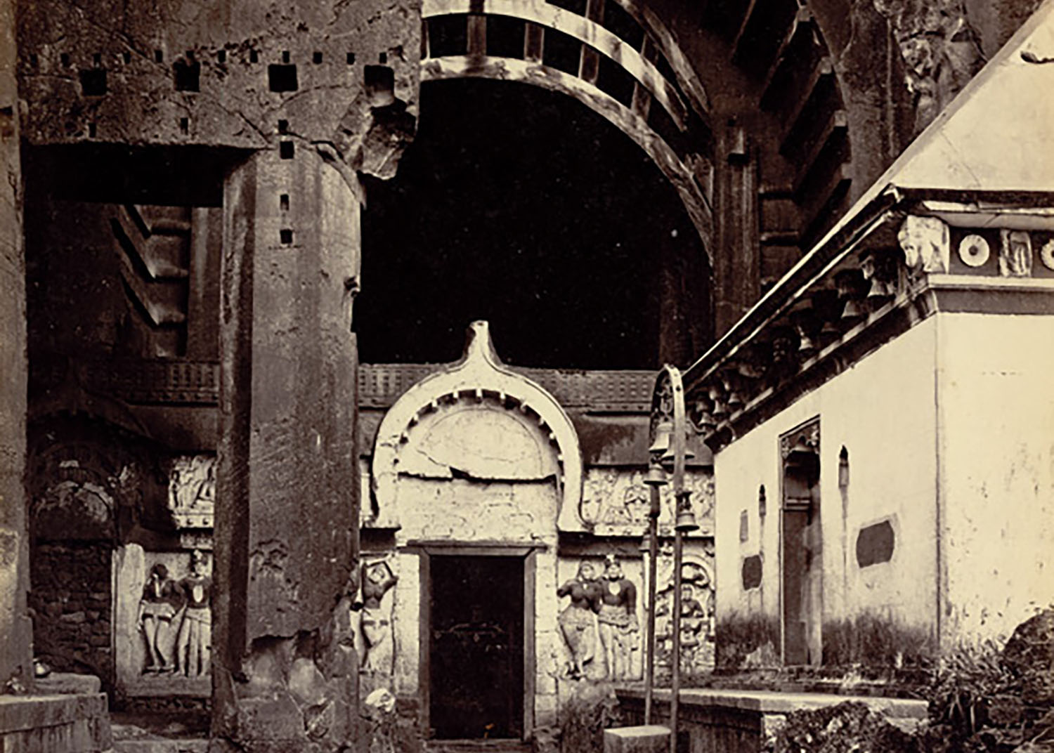 There have been several modifications to the edifice over the period of its occupation. The chaitya was originally aniconic, but figures of the Buddha and his attendants were added in the veranda and the front wall. A sculpture of the Buddha with the bodhisattvas Padmapani and Manjushri was also inserted at the entrance. New sculptures were also similarly installed at the older cave sites of Nasik and Kanheri, suggesting that these were all tied to changes in theology and patterns of patronage in the early centuries CE.