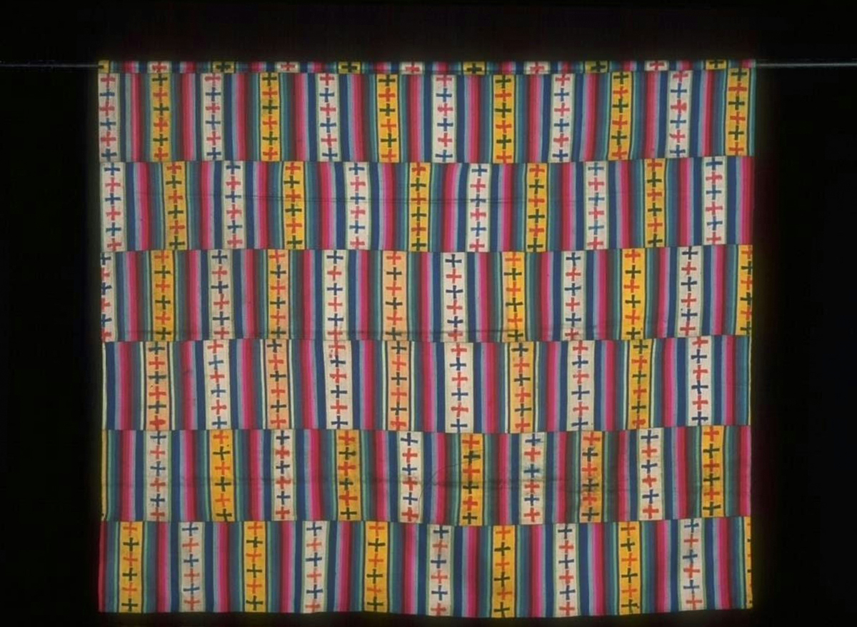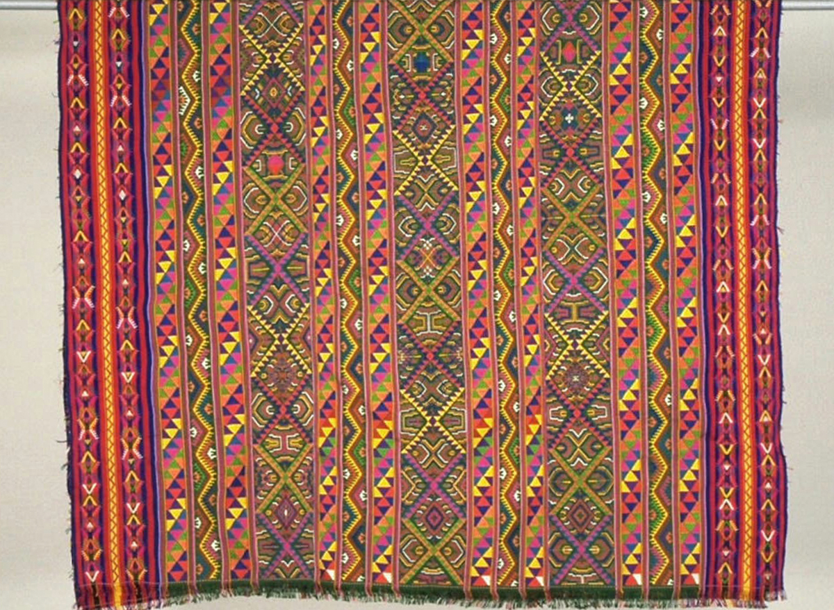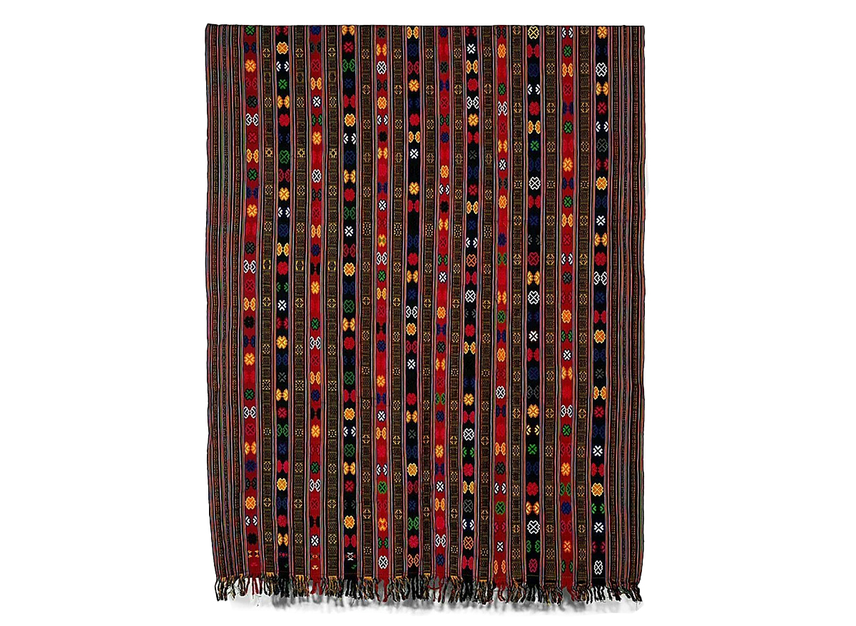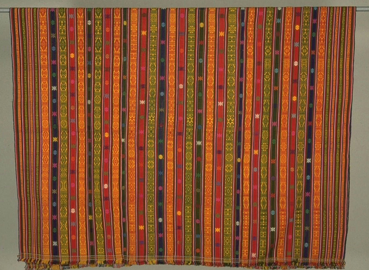 Besides the common warp-wise stripes, the fabric is also densely patterned with colourful geometric motifs such as the Tree of Life (shinglo), multi-coloured triangles (tenkhep metho), double thunderbolts (dorji jadram), swastikas (yurung), flowers, as well as shapes resembling sun rays, the wings of a fly (jam gi shogdro), and birds’ eyes (jagi mikto).