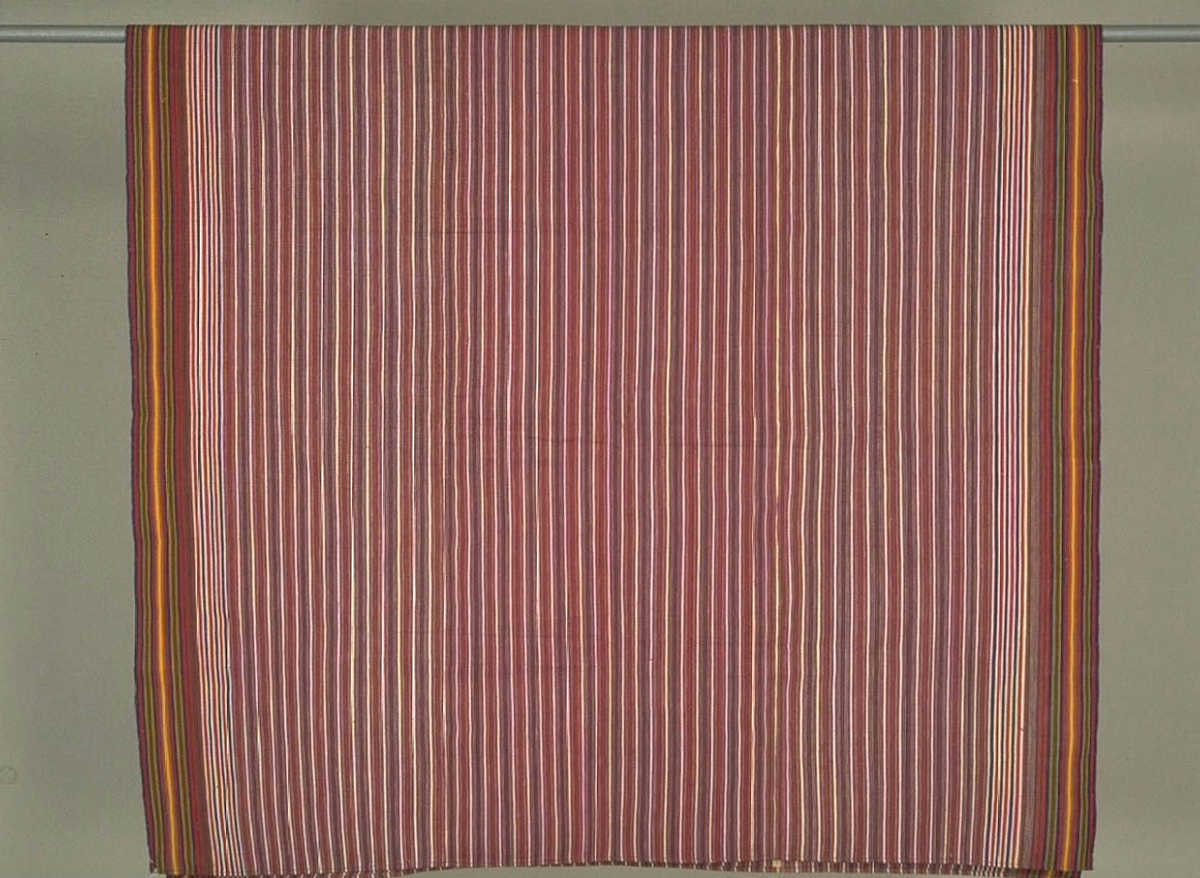 Until the early twentieth century kira fabrics were largely restricted to warp-striped textiles — most commonly the white cotton thara featuring red, black and yellow stripes. Others included montha or rigpa thara, a type of aikapur with a white ground, rainbow stripes and red and blue bands; yutham, a colourful striped wild silk or cotton textile; shabthrawo, a wild silk textile with red and white stripes; and tarichem, a woollen fabric with red and blue stripes on a black ground.