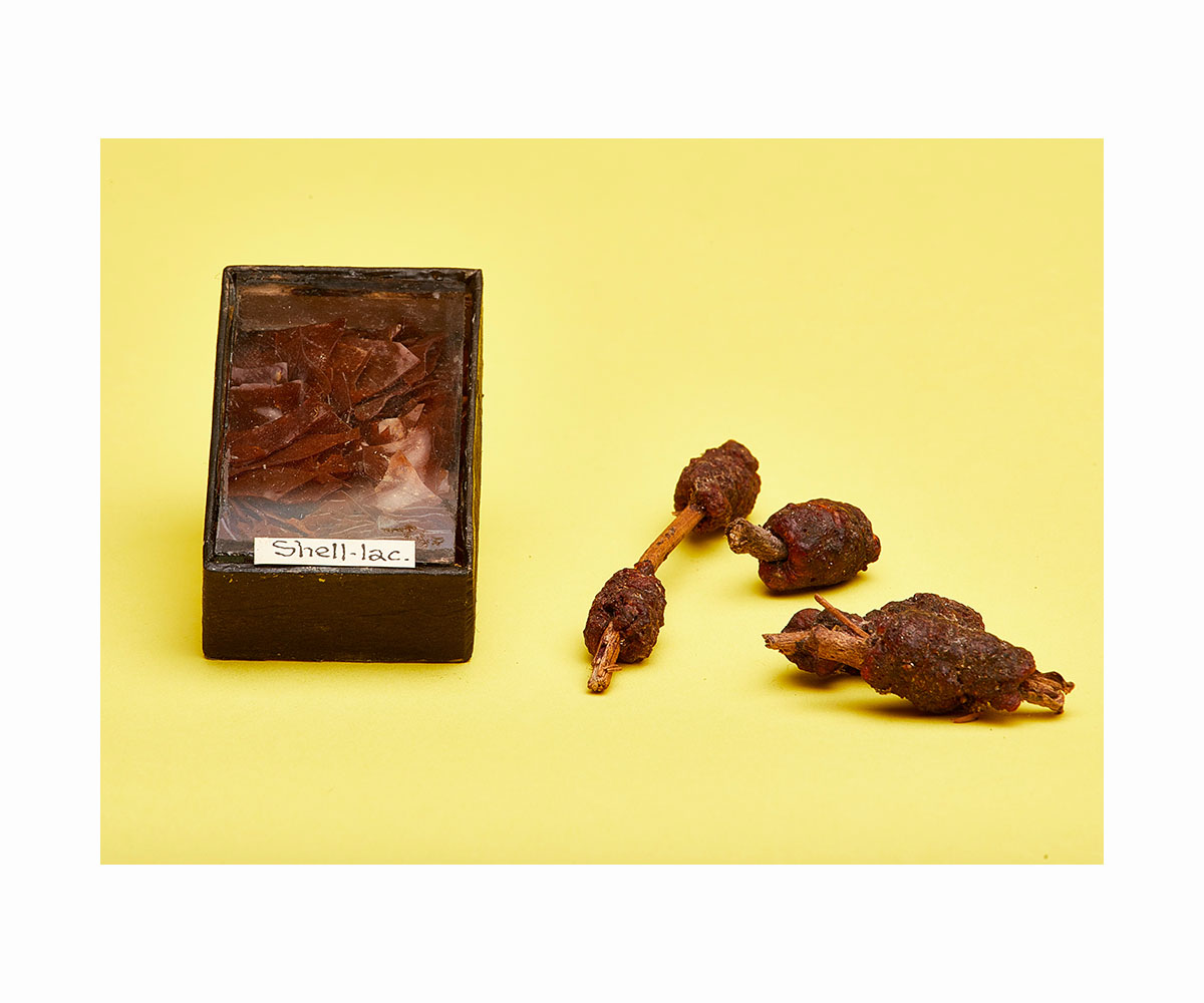 The lac insect is a crimson-red species referred to scientifically as kerria lacca or tachardia lacca, found in the forests of India and Thailand. The process begins with cultivating these insects and refining the lac extracted from them. This lac is then stored and made available in the form of flattened cylindrical coins. The quality of lac is determined by its colour — light golden, brown and dark black — wherein the former is the best quality and most expensive as well. Lac in this form is then melted with limestone to prepare the base or dough for any object; limestone is used to provide additional strength. The lac is melted in a vessel and when it is in a semi-molten state, the mixture is stirred and attached to the end of a wooden stick. The semi-molten lac is then flattened and shaped into the desired shape using a flat wooden tool locally known as hatta and a metal plate known as a silla. In the case of a bangle, the most popular craft commodity made from lac, the semi-molten lac is rolled onto a metal bangle ring or directly rolled into its desired diameter and thickness. In case colour is to be applied to the object, coloured lac is heated and melted and then it is evenly rubbed onto the object. The process is finished by cooling, drying and polishing the surface. Lac may also be poured into moulds of different shapes to get the desired result.