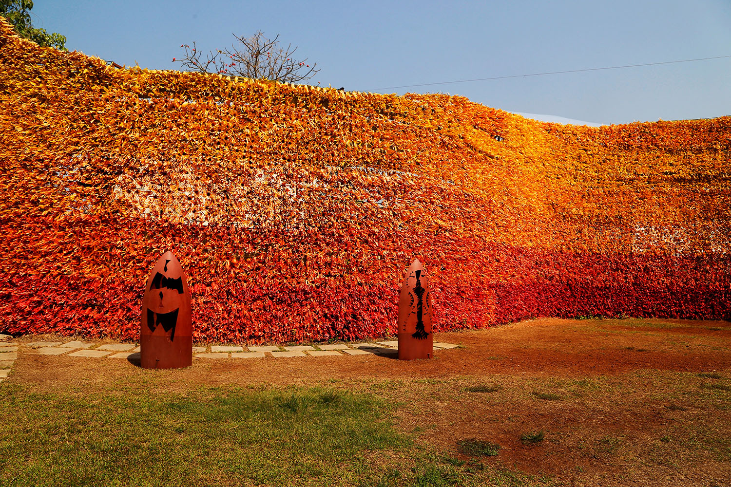 Subodh Kerkar, Shweta Bhattad, Atul Bhalla and Ravi Agarwal are some of the artists in India whose works and practice are associated with land art. MS Umesh’s Earthworks (1996) in Kodigehalli, Karnataka, represents the destructive effects of urban and industrial development. Kerker’s work The Earth Bowl (2011) created in Vagator Beach, Goa, consists of a large bowl carved into the landscape, which fills and empties to the rhythm of the tides. Agarwal’s work Else, all will be still (2011–13) is an exploration of the relationship between the sea and human practices that depend on the sea and river ecologies. Bhalla’s project Immersions (2013), part of a larger body of work that explores the ecology of water and rivers in India, highlights the rampant pollution of rivers through his concrete casts of bottles and portable containers placed in water-filled cases. Bhattad highlights the issues faced by farmers in India through her initiative Gram Art Project. The artist Vivan Sundaram has also made a notable contribution to the genre in his installation Black Gold at the 2013 Kochi-Muziris Biennale. The work incorporates discarded potsherds from the archaeological site of Pattanam to recreate a miniature city-like conurbation that also evokes the history of the ancient port of Muziris.