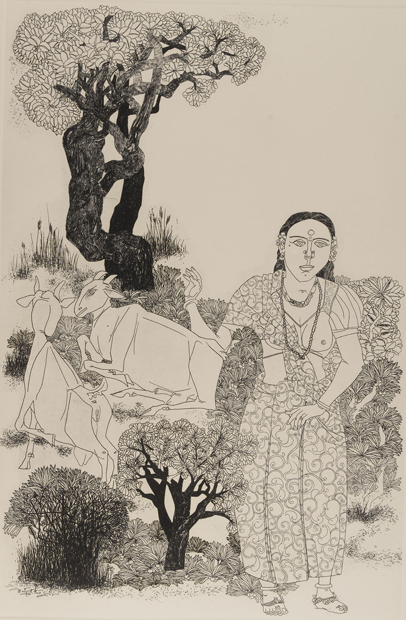 A modernist painter and printmaker, Kalal Laxma Goud is known for his rustic figurative sketches, paintings and prints that depict rural life, eroticism and landscape.