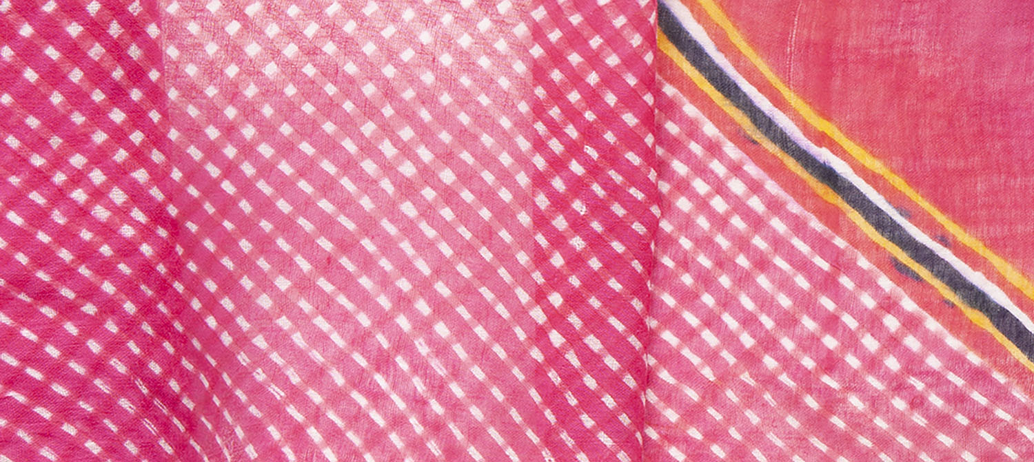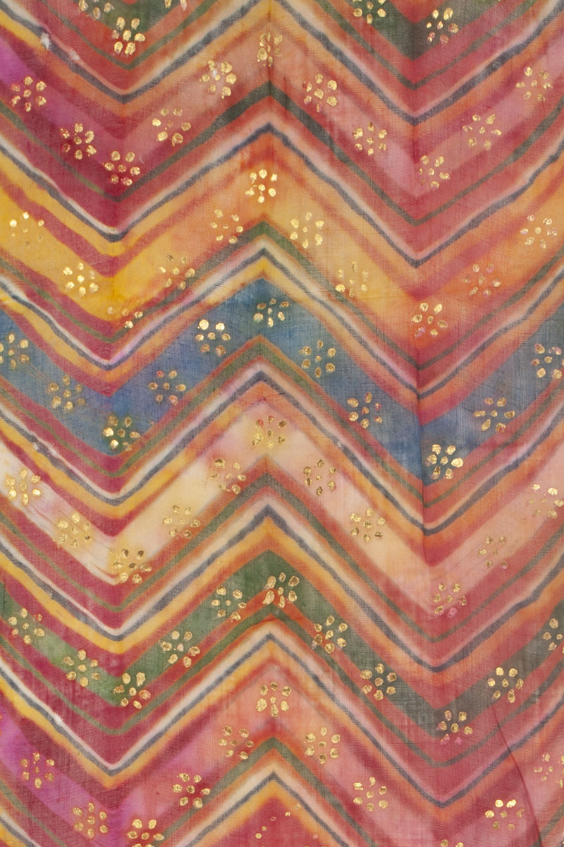 A wrap-resist-dyeing technique practised in the state of Rajasthan, leheriya is known by its distinct patterns of stripes, chevrons and diagonals. It is traditionally found on the safas (turban cloths) worn by Rajasthani men and the odhanis worn by the women, as well as on sarees. Leheriya derives its name from the Sanskrit word lahara, meaning “wave,” and refers to the inspirations behind the designs: the monsoon season — a time of celebration in the state — as well as the patterns created by the wind on the desert sand.
