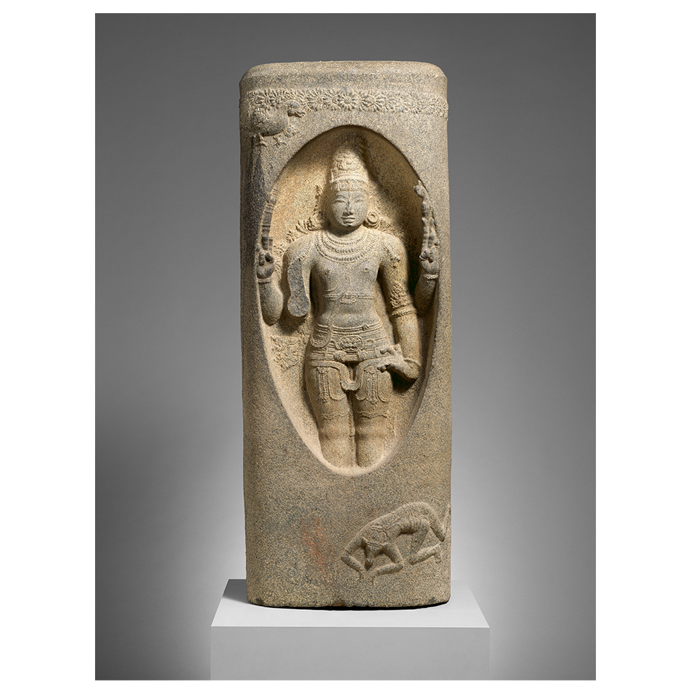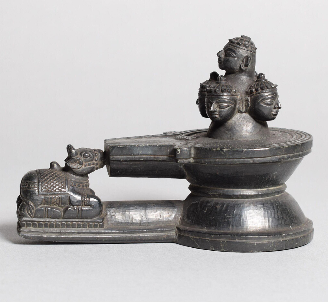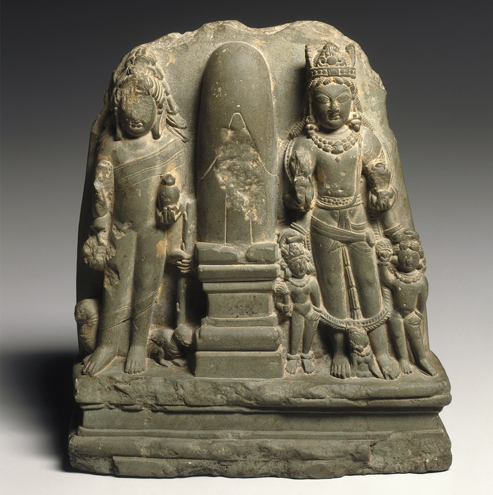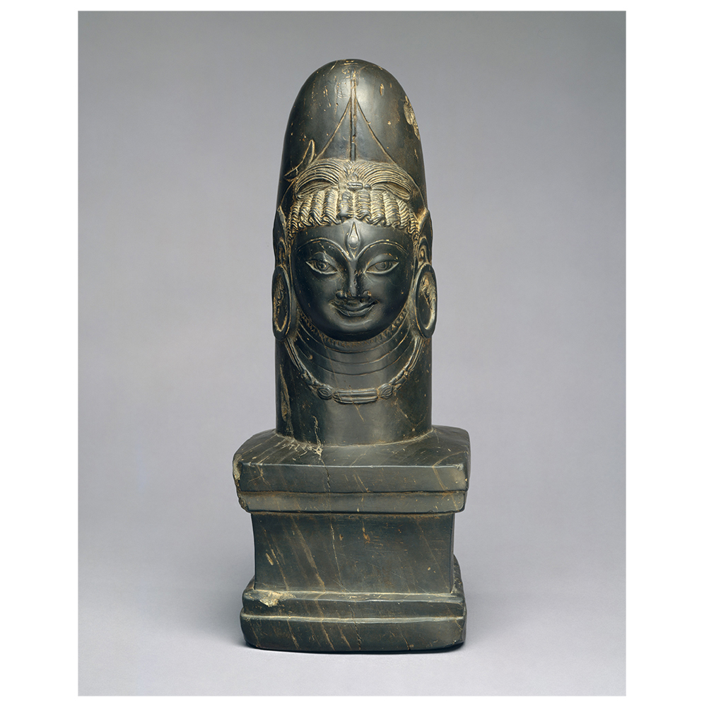 An aniconic representation of the Hindu deity Shiva, the lingam or linga (Sanskrit, meaning ‘sign’ or ‘symptom’) is typically a short, upright cylindrical column rounded at the top. Deriving from representations of the phallus that predate Vedic religion, lingams vary in size and design depending on ritual specifications; some naturally occurring formations are also worshipped as lingams. Central to Shaivite iconography, the lingam is the most common form of the Shiva image in temples and shrines across South and Southeast Asia, where it is commonly made of stone, and almost always set on a flat pedestal or pitha that represents the yoni or vulva.