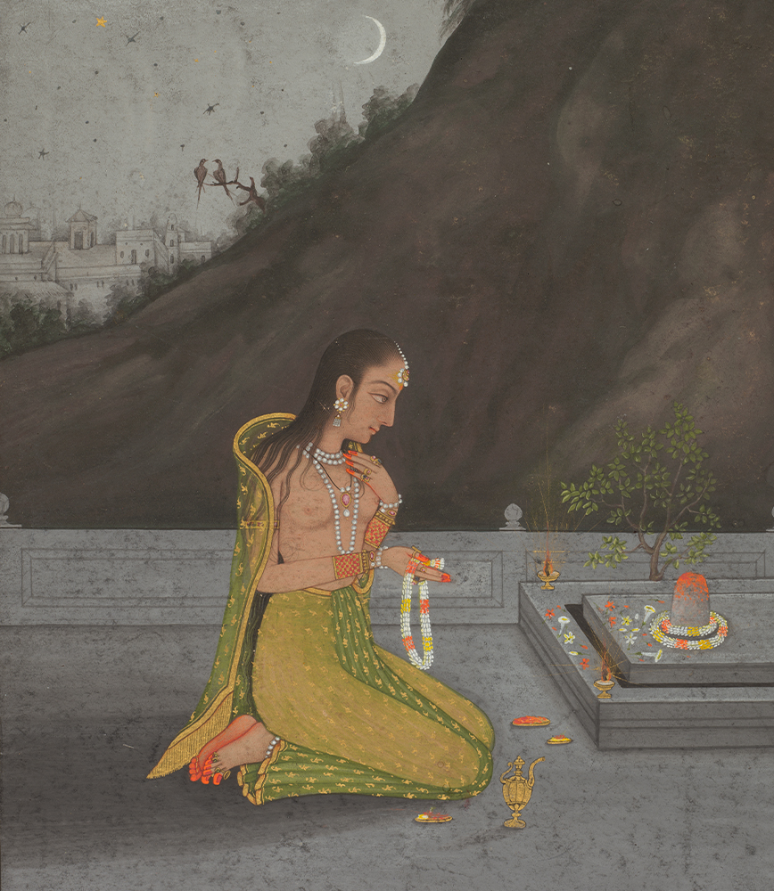 A night scene of Shiva puja; Muhammad Rizavi Hindi, Ahmad al-Husaini; Mughal; Lucknow, India; 1760–70; Gum tempera and gold on paper; 28.2 x 24. 1 cm; The Cleveland Museum of Art, Ohio