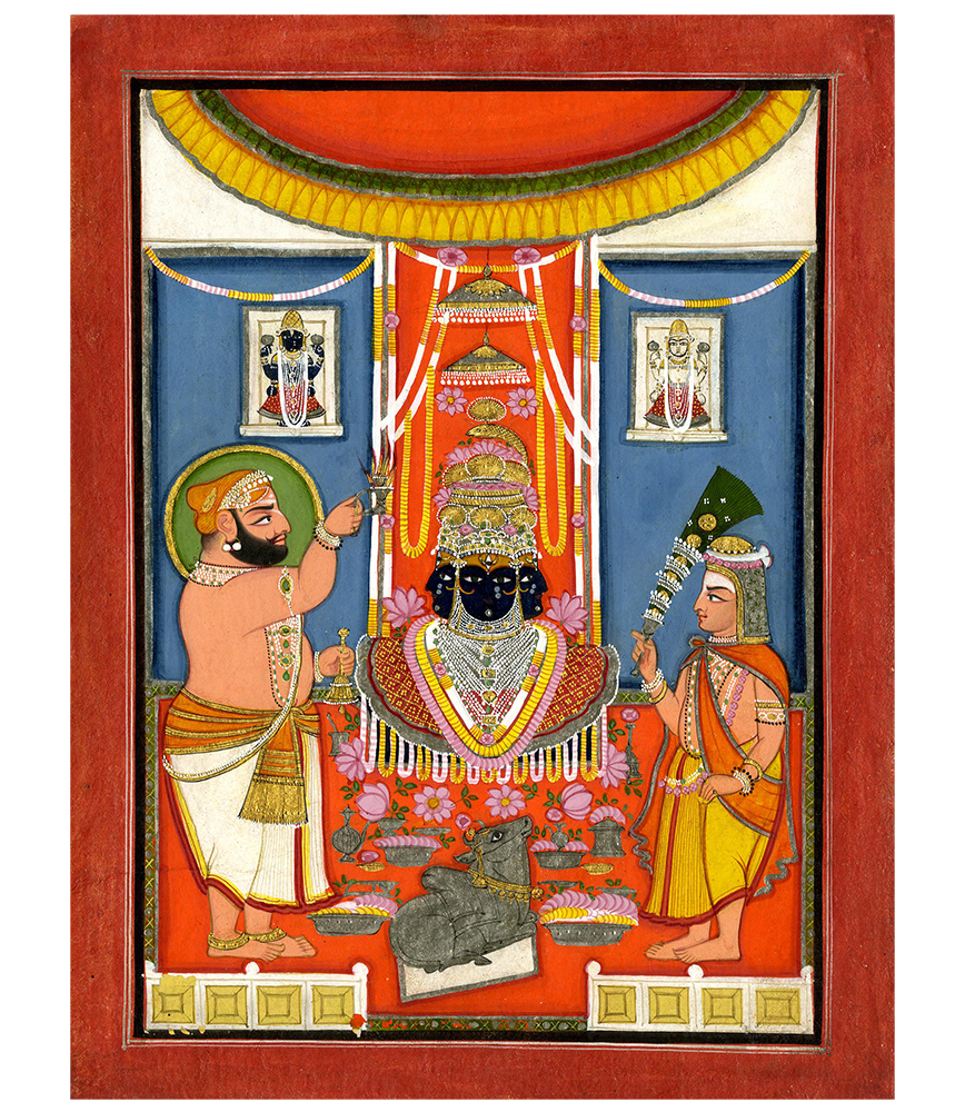 Linga with three faces, enshrined with two worshippers, probably at the temple of Eklingji; Udaipur, Rajasthan, India; c. 1830; Gouache on paper; 21.9 x 16.7 cm; The Trustees of the British Museum