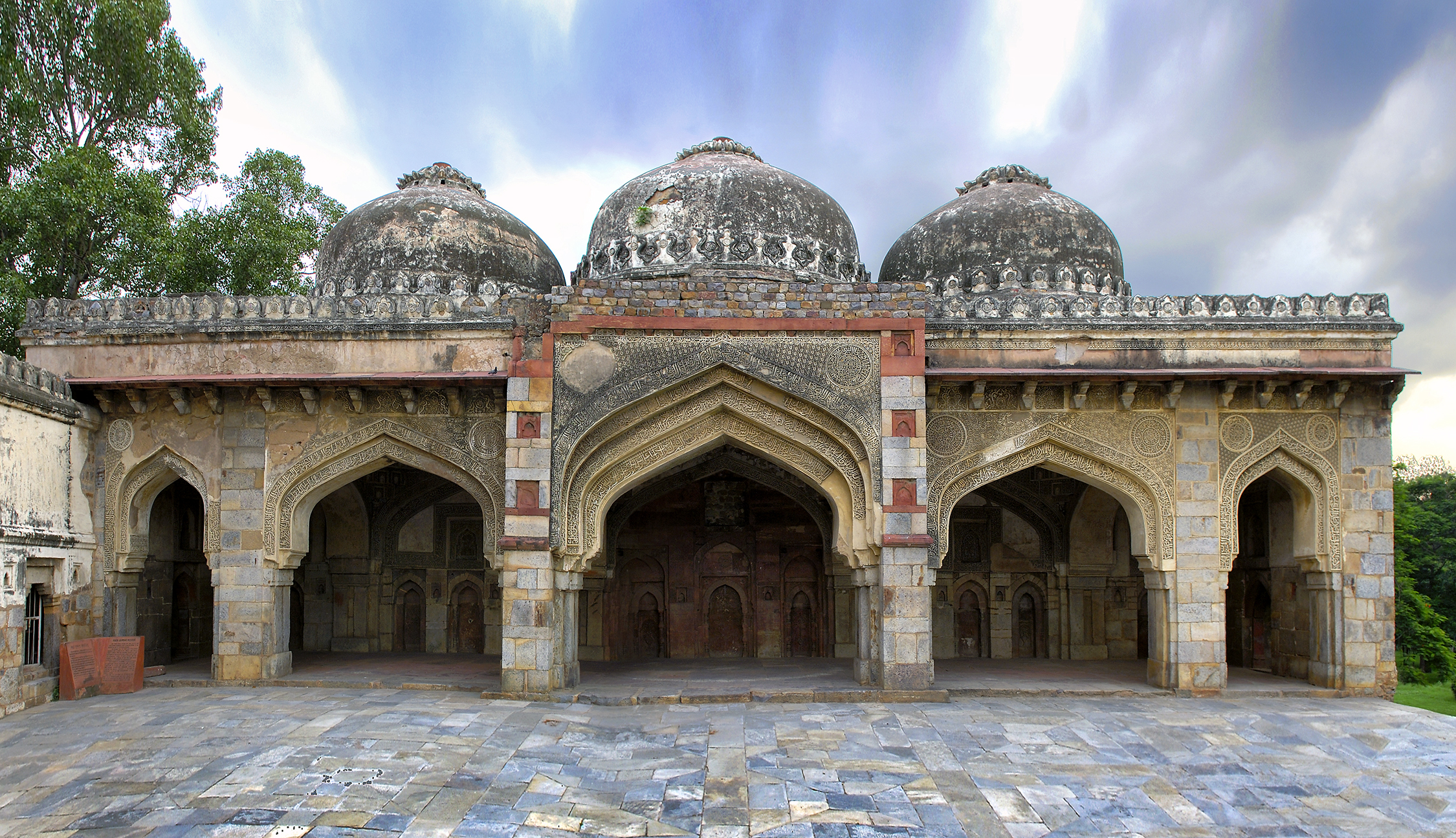 The mosque is a small arcade-like structure that is entered from the courtyard through five arches, the central one being the largest and most heavily ornamented. A bracketed cornice runs along the face of the structure, interrupted by the pishtaq, or square frame, around the central arch. Three domes with lotus crest finials surmount the structure, supported by vaults formed between the three central bays and the qibla wall. This wall is thereby divided into five arches, each of which in turn houses sets of three arched niches. The central niche of each of these is crowned by a small but ornately carved arch. Similar arches line the base of each dome on the inside, imitating a circular gallery. The squinches, spandrels and edges of all the arches are covered in incised and painted limestone plasterwork, which came to be a distinctive decorative feature of Lodi-era mosques. The decoration largely takes the form of calligraphy of Quranic verses and, to a lesser extent, patterns of small floral and geometrical motifs, though some portions of this carved layer have broken and fallen off over time. The mihrab bears an inscription that dates the mosque to 1494.