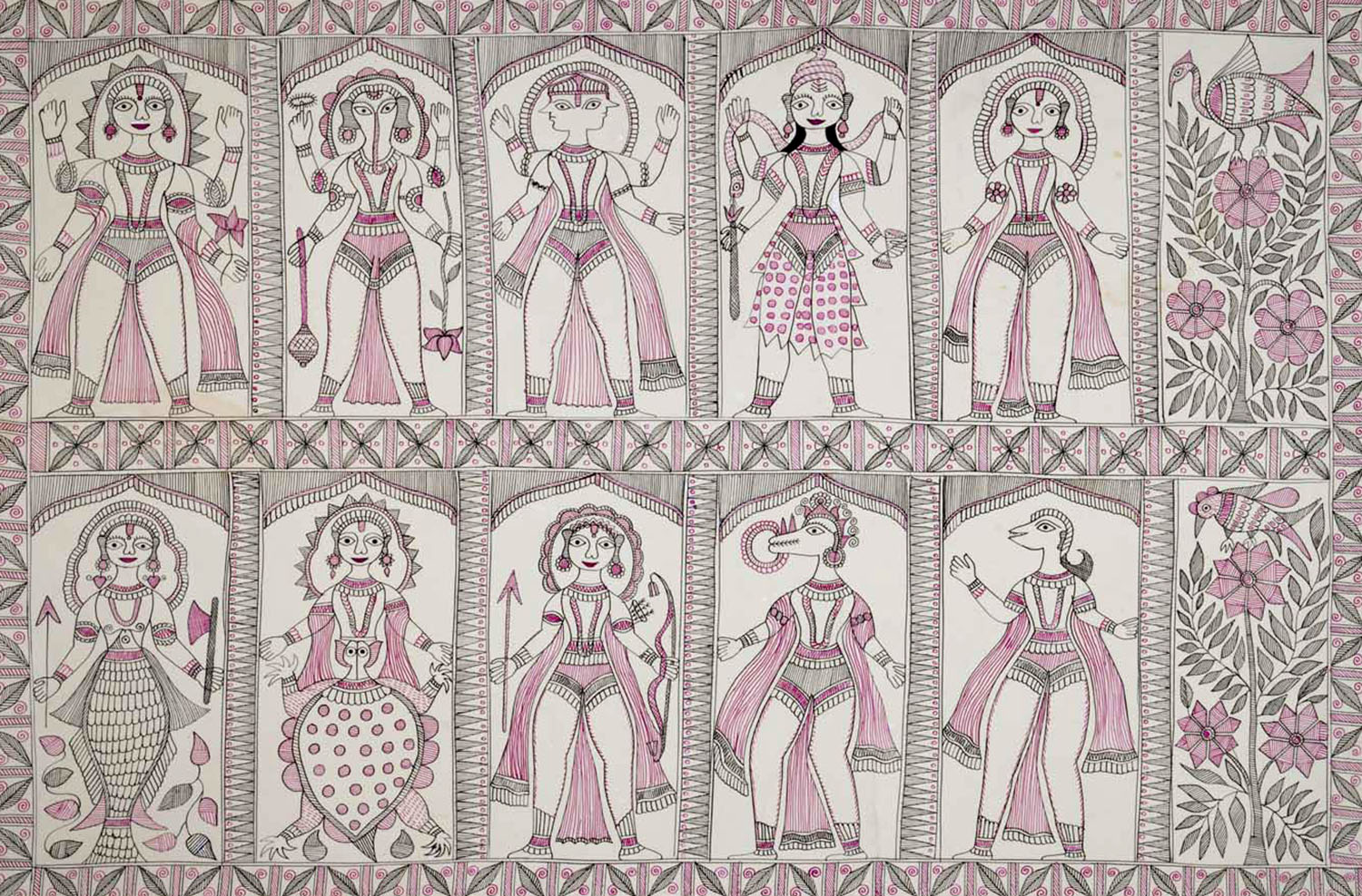 The themes in Devi’s paintings, rendered in the convention of traditional Mithila wall painting, range from mythology, cosmology and nature to royal court scenes and everyday social events. Gods of the Hindu pantheon such as Shiva, Rama, Durga, Lakshmi and Saraswati were especially important and featured in established mytho-religious tableaux such as Sita Swayamvar and Radha-Krishna Leela. Her style was simple and direct, with the colours applied in a flat, ungraded manner that emphasised the picture plane. Heavily patterned borders coupled with lines and crosses filled up most of the negative space — the complete utilisation of space being a major characteristic of the Madhubani tradition — and animated the picture plane.