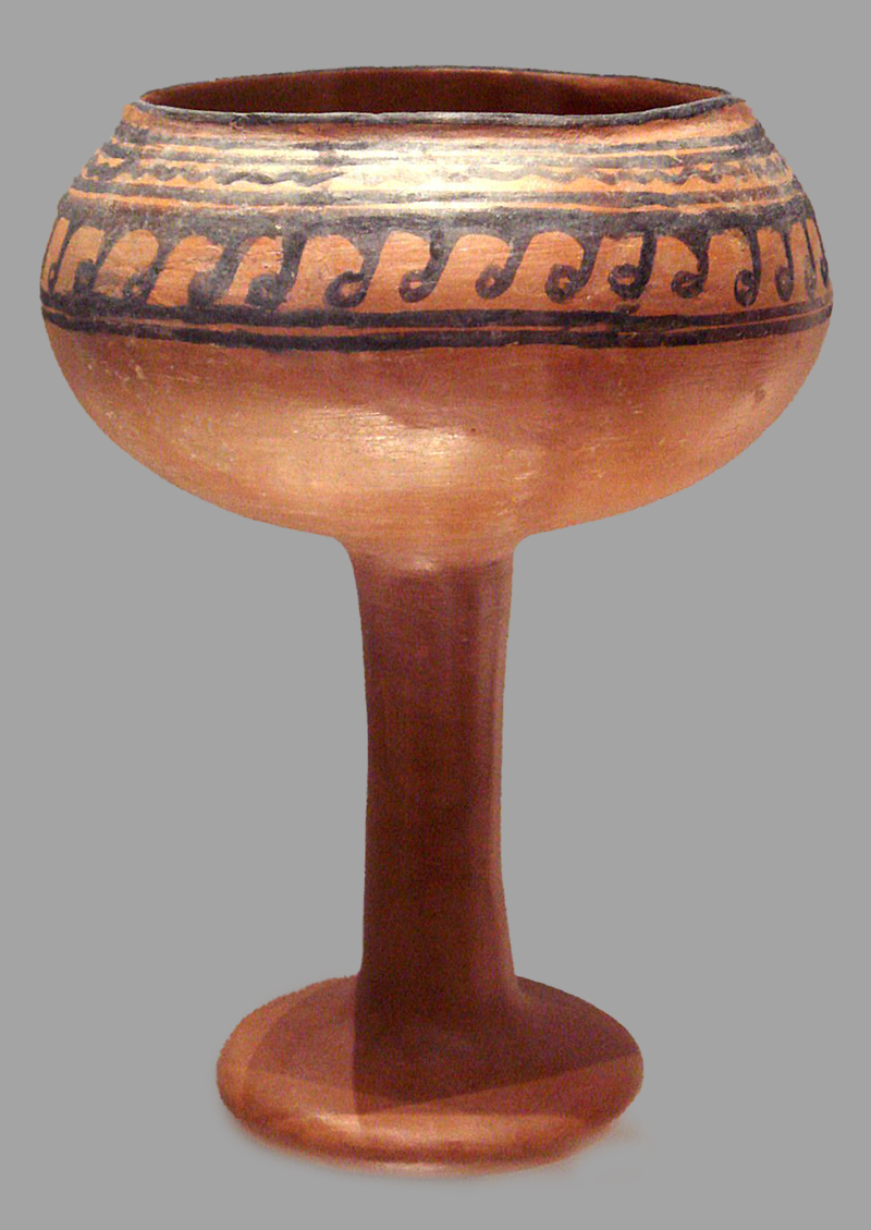 The Malwa Culture is known for its distinct pottery styles, comprising wheel-made black-on-red ware, coarse red ware and red/grey ware, of which the black-on-red ware — also known as black-painted red ware — was most prolific. The fabric of the pottery ranged from coarse, with pieces of chopped husk in the core, to fine (predominantly in Maharashtra). The types of objects made include a utensil resembling a lota, with a wide flaring mouth and bulbous base with carination or ridges on the body, a channel-spouted bowl, deep bowls with carination, a spouted vessel with a flaring mouth distinct to Maharashtra, globular jars, deep bowls, knobbed lids and basins. Navdatoli is the only site where goblets or drinking chalices were found.