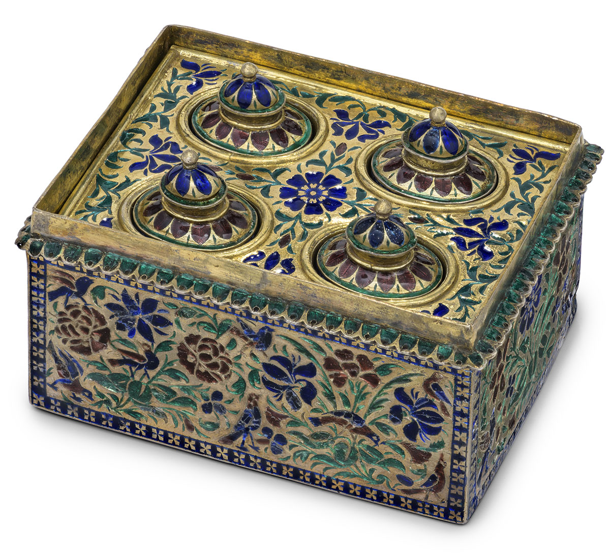 Today, apart from being used on the reverse side of kundan jewellery, meenakari is also done on decorative and display objects in the shape of elephants, horses, masks to be hung on walls, bowls, jewellery boxes, etc.