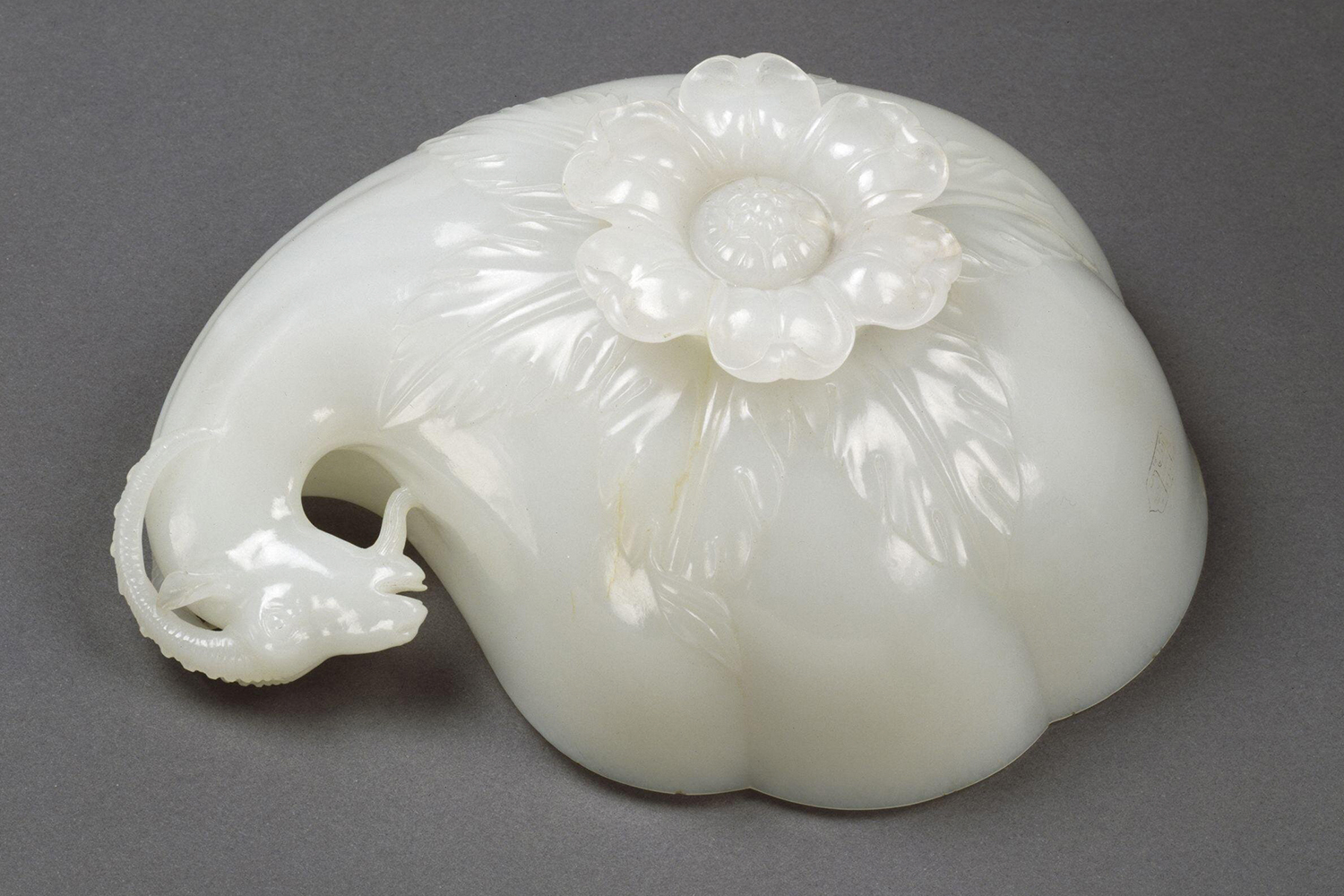 Another wine cup in the collection of the V&A Museum, dated to 1657, was probably crafted for emperor Shah Jahan. It is made of white nephrite jade and shaped like a gourd with a ram-head handle. The underside of the cup has a supporting base in the form of a lotus flower flanked radially by extending acanthus leaves. Reflective of the cultural cosmopolitanism that characterised Mughal visual culture, the wine cup combines Indic, Chinese as well as European influences into its visual language. The ram-head handle and the lotus base are clearly elements borrowed from Hindu art, the gourd body is borrowed from Chinese models and the acanthus leaves show the influence of European art introduced through the prints and paintings brought by Jesuit missionaries to the Mughal court. However, despite this iconographic polyvalence, the artist manages to lend a stylistic unity to the wine cup, considered a hallmark of the arts of the Mughal court.