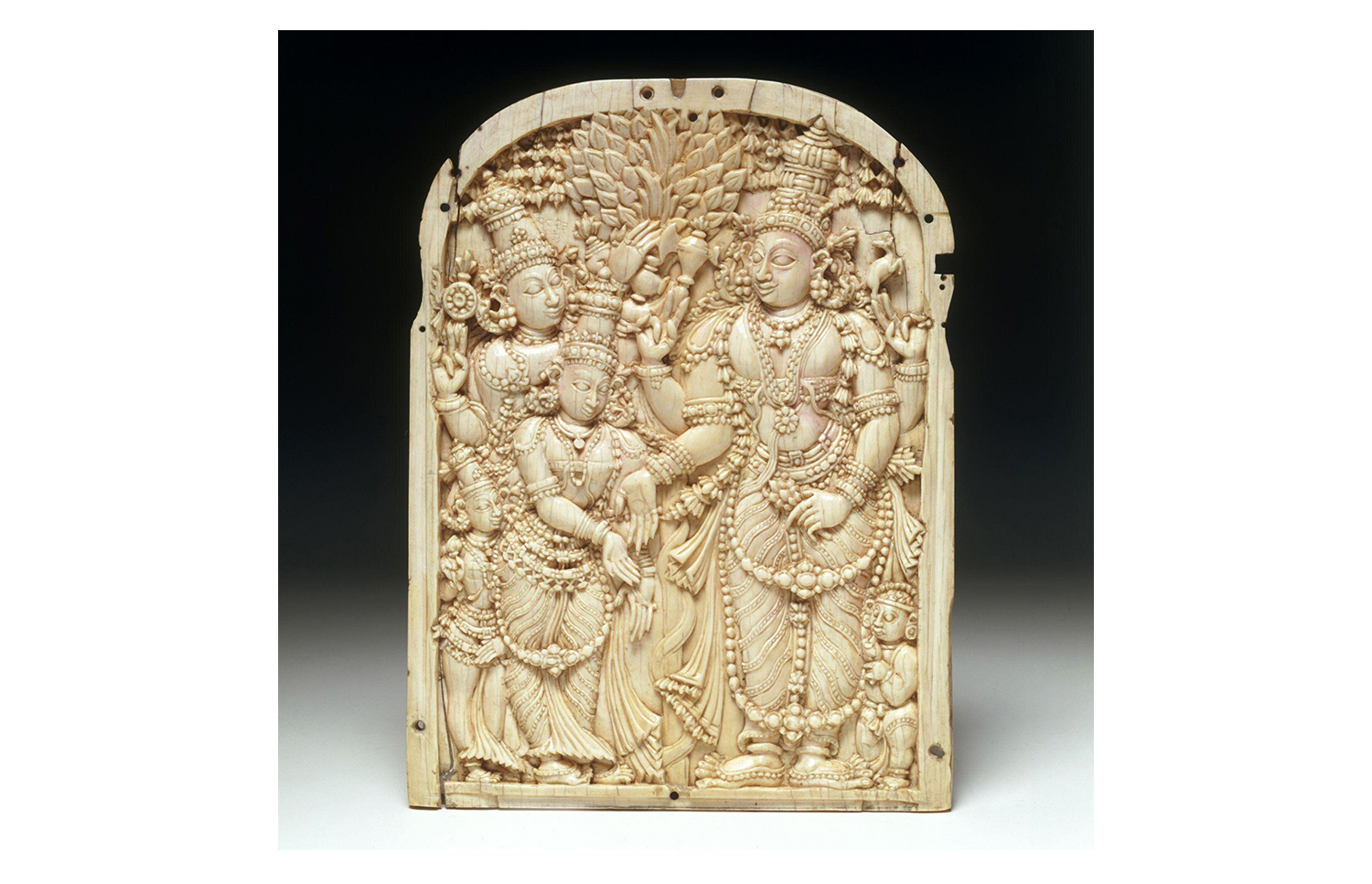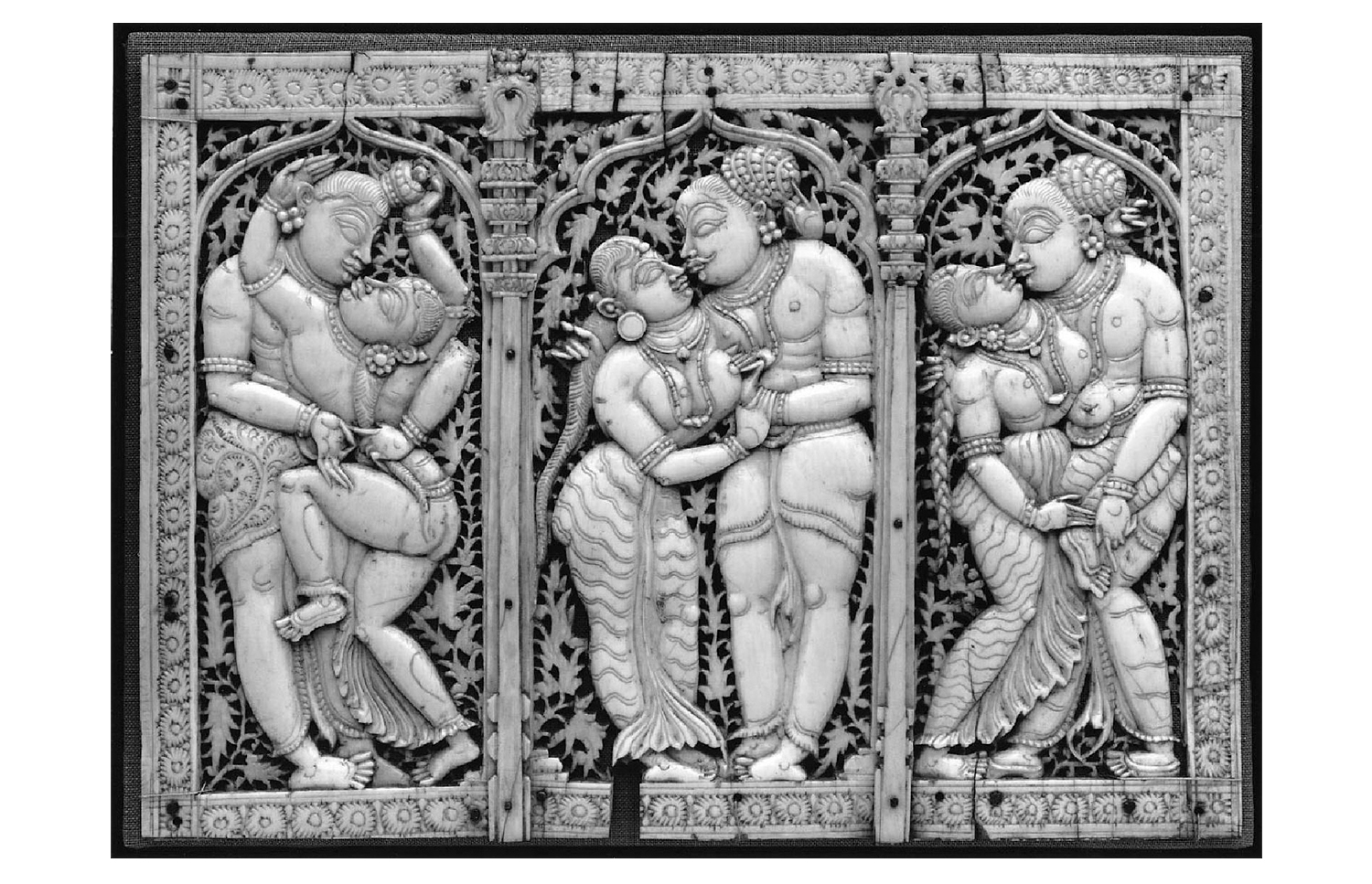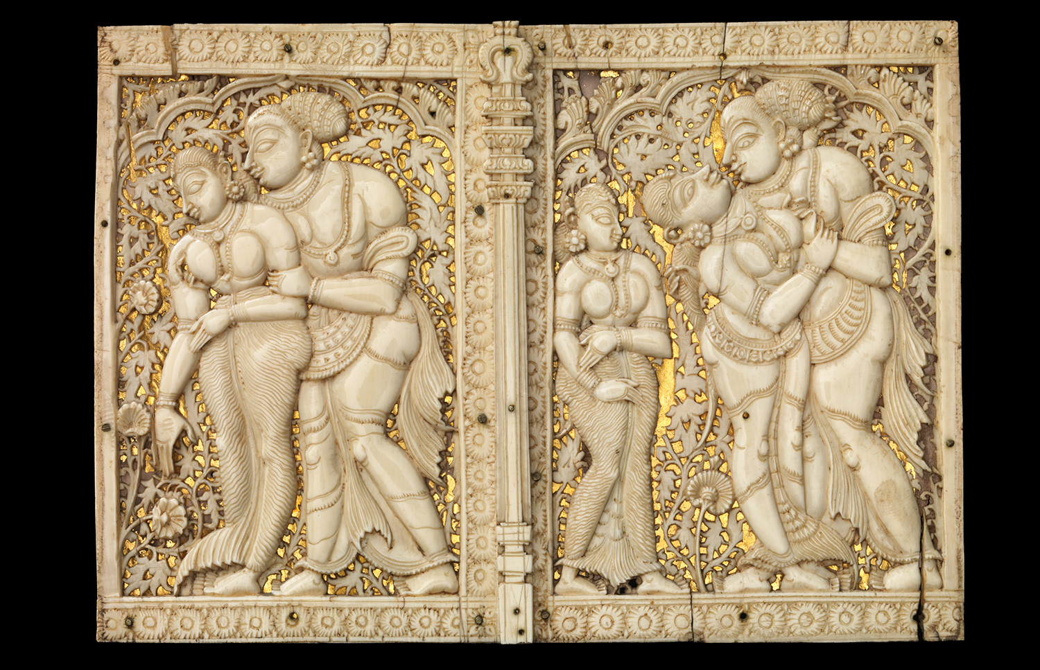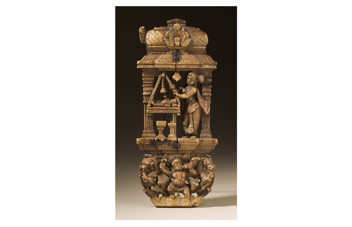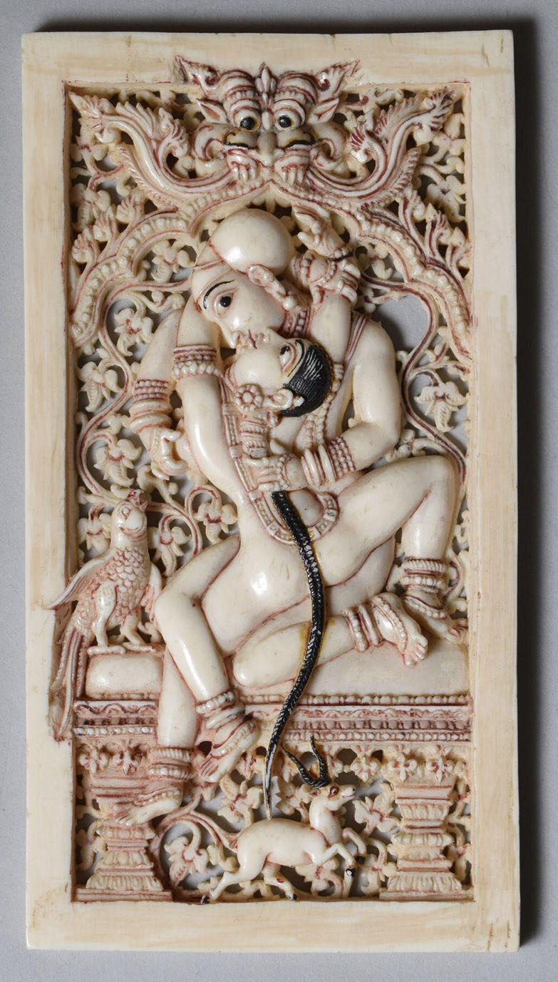 Produced between the sixteenth and seventeenth centuries in workshops patronised by the Madurai Nayaka rulers, Nayaka ivories mark the apogee of the ivory carving tradition in southern India and include sculptures in the round, furniture ornaments and low to high relief panels made for wooden caskets. The themes expressed in these ivory objects ranged from the religious to the secular and were associated with both the temple and palace domains of Nayaka rulers. Images which celebrated love and pleasure were especially popular, including depictions of mithuna couples and the marriage of Shiva and Parvati. Given their small size, intricacy and often functional nature, the ivories were likely carved by jewellers in workshops located in the Kaveri basin of Tamil Nadu in India.