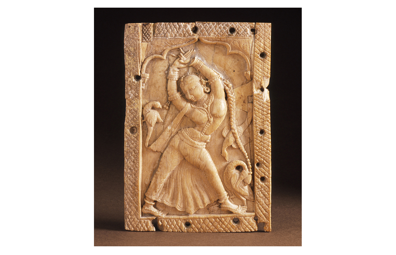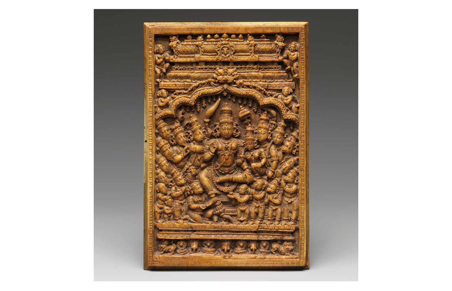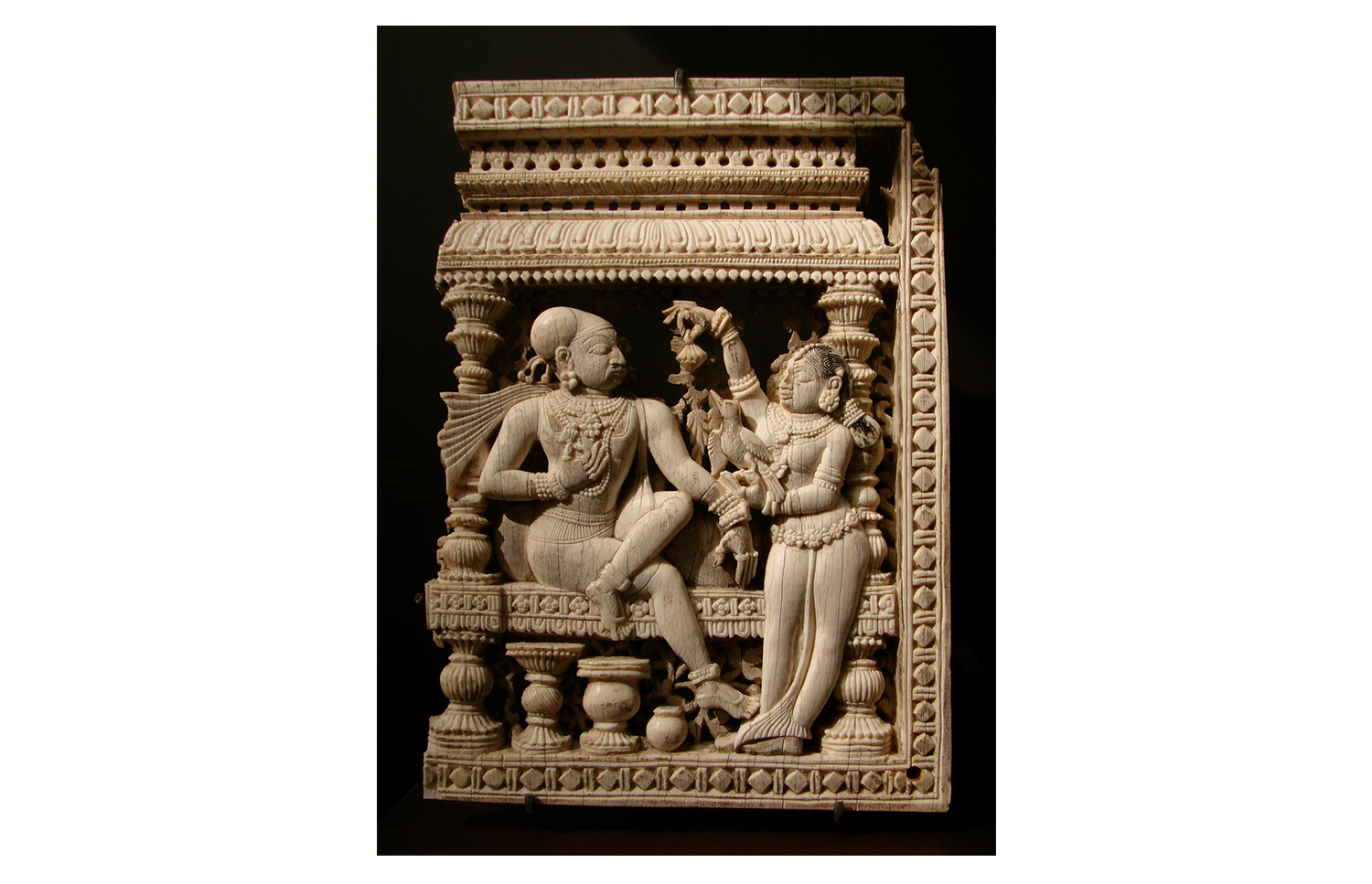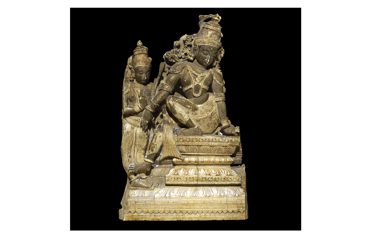 Produced between the sixteenth and seventeenth centuries in workshops patronised by the Madurai Nayaka rulers, Nayaka ivories mark the apogee of the ivory carving tradition in southern India and include sculptures in the round, furniture ornaments and low to high relief panels made for wooden caskets. The themes expressed in these ivory objects ranged from the religious to the secular and were associated with both the temple and palace domains of Nayaka rulers. Images which celebrated love and pleasure were especially popular, including depictions of mithuna couples and the marriage of Shiva and Parvati. Given their small size, intricacy and often functional nature, the ivories were likely carved by jewellers in workshops located in the Kaveri basin of Tamil Nadu in India.